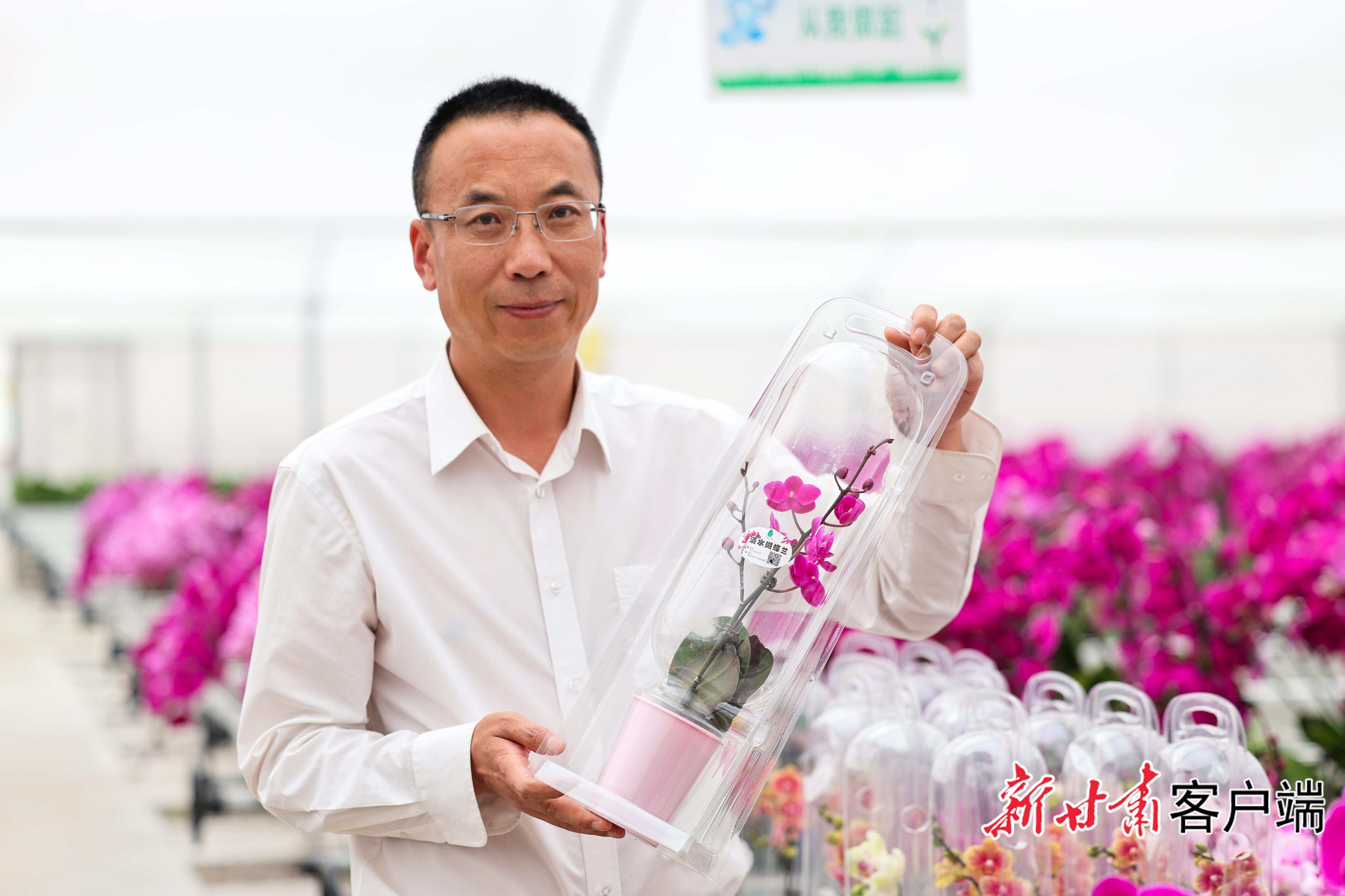 张伟展示向外地游客赠送的蝴蝶兰。新甘肃·甘肃日报记者 冯乐凯摄