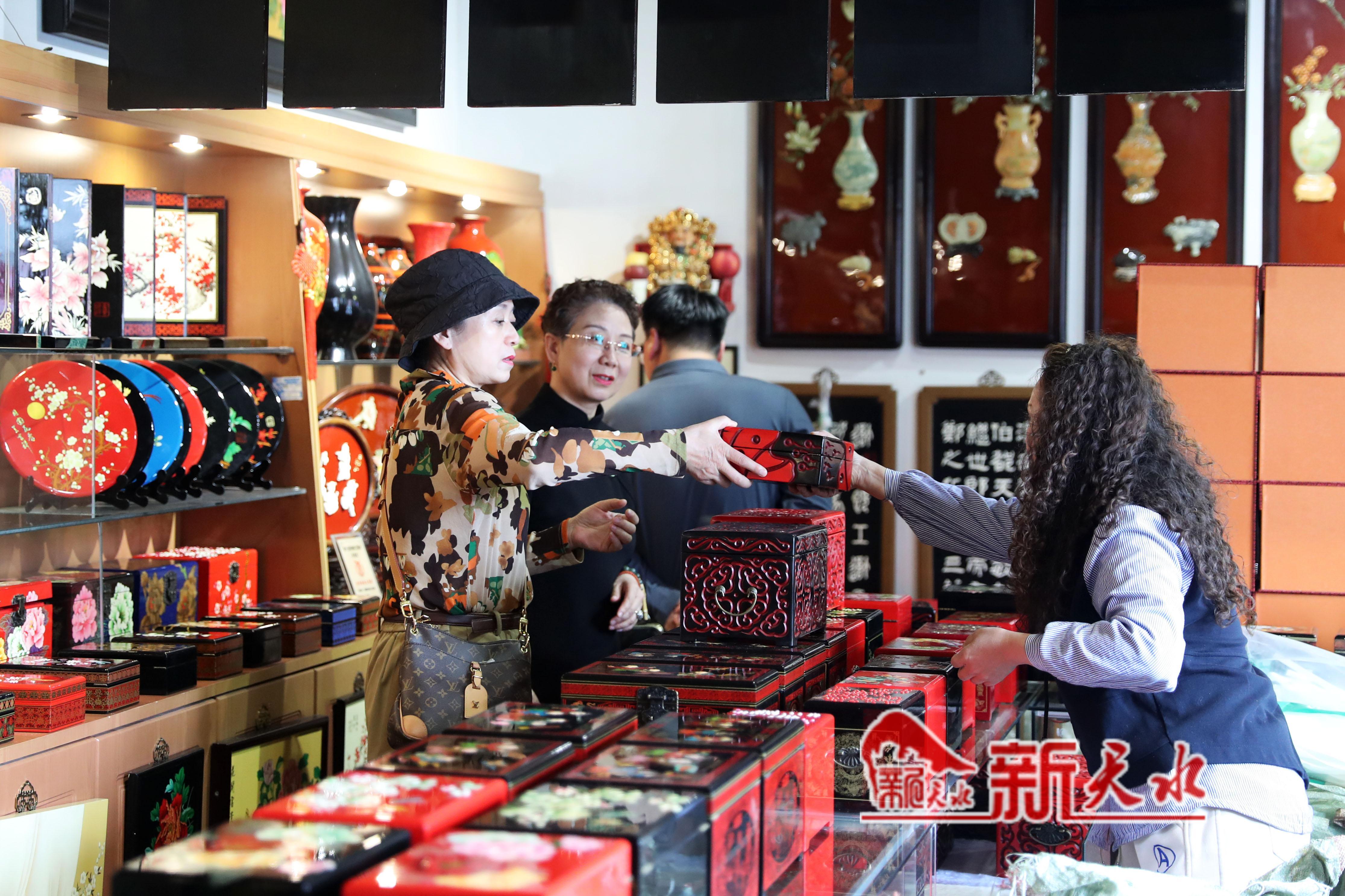 4月17日,游客正在伏羲庙景区选购雕漆产品。随着天水麻辣烫的火爆出圈,来我市旅游的各地游客激增,作为我市文化名片之一的天水雕漆产品也深受游客的喜爱,销量大增。