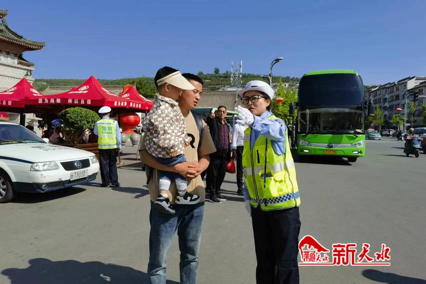 4月26日 ,天水市公安局秦州公安分局城区交警大队五中队民警在伏羲庙东牌坊附近执勤,为做好游客服务保障工作,他们中队全员上岗、全天候执勤疏堵保畅,每天都会接到不少求助。