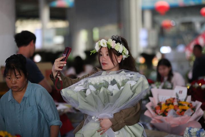 昆明斗南花卉交易市场内,游客正在抱着花束拍照打卡。(受访者供图)