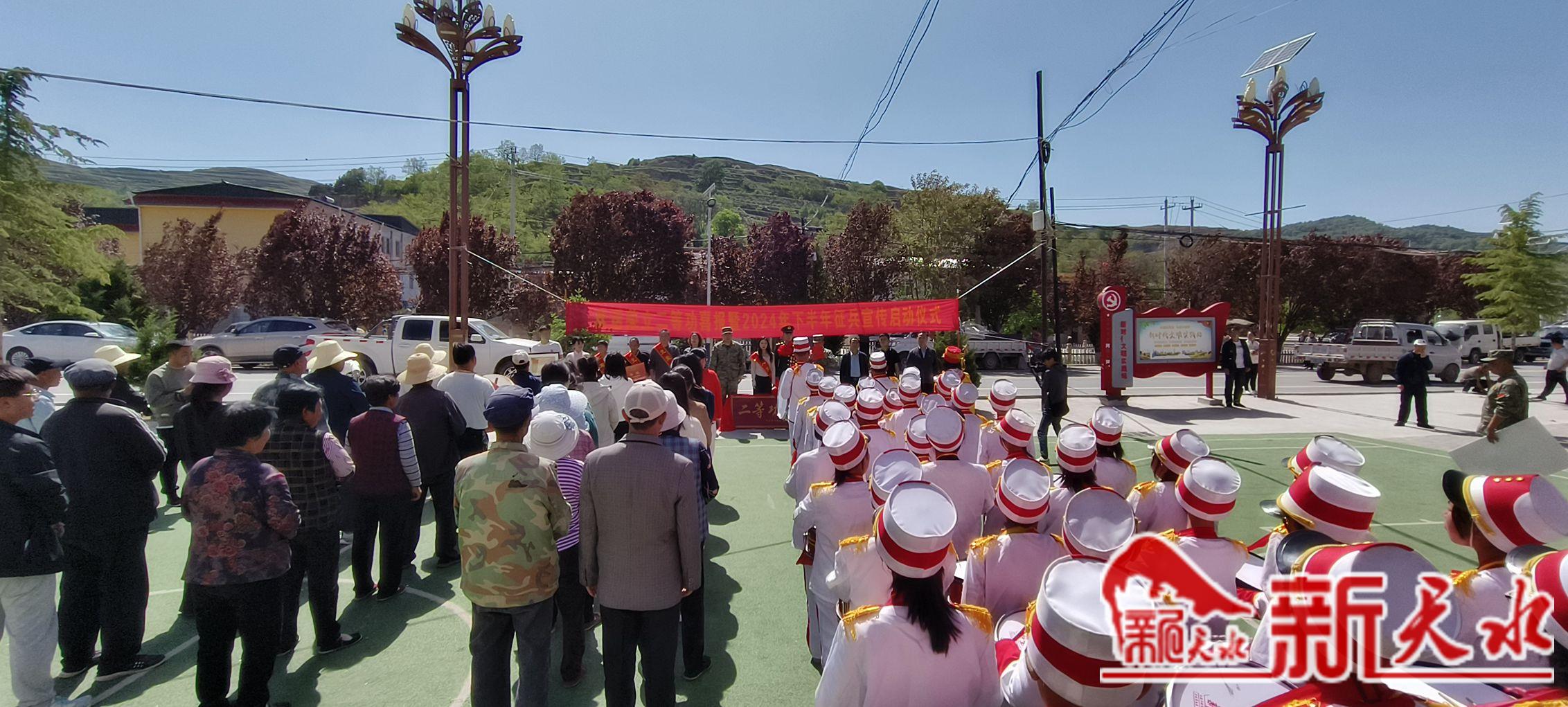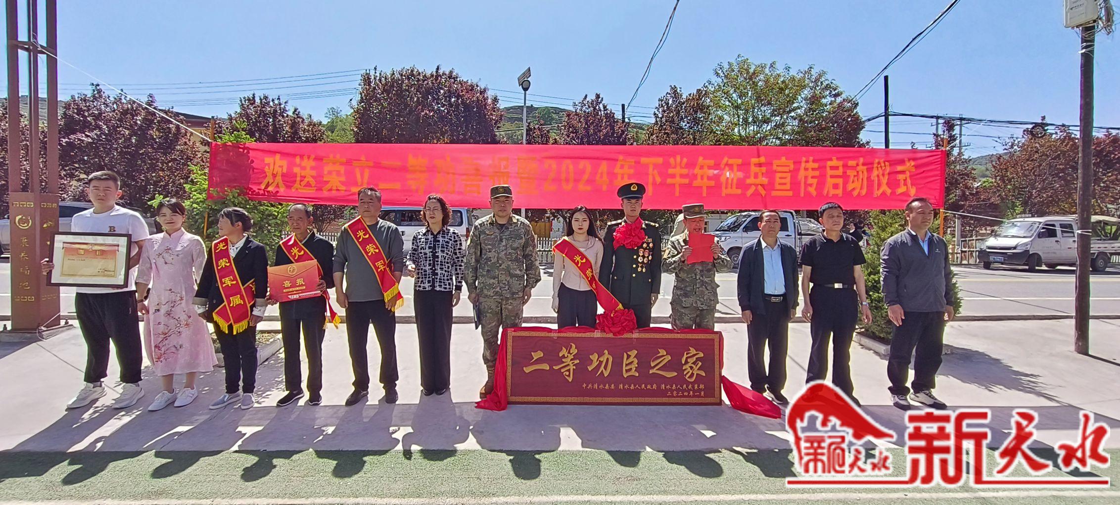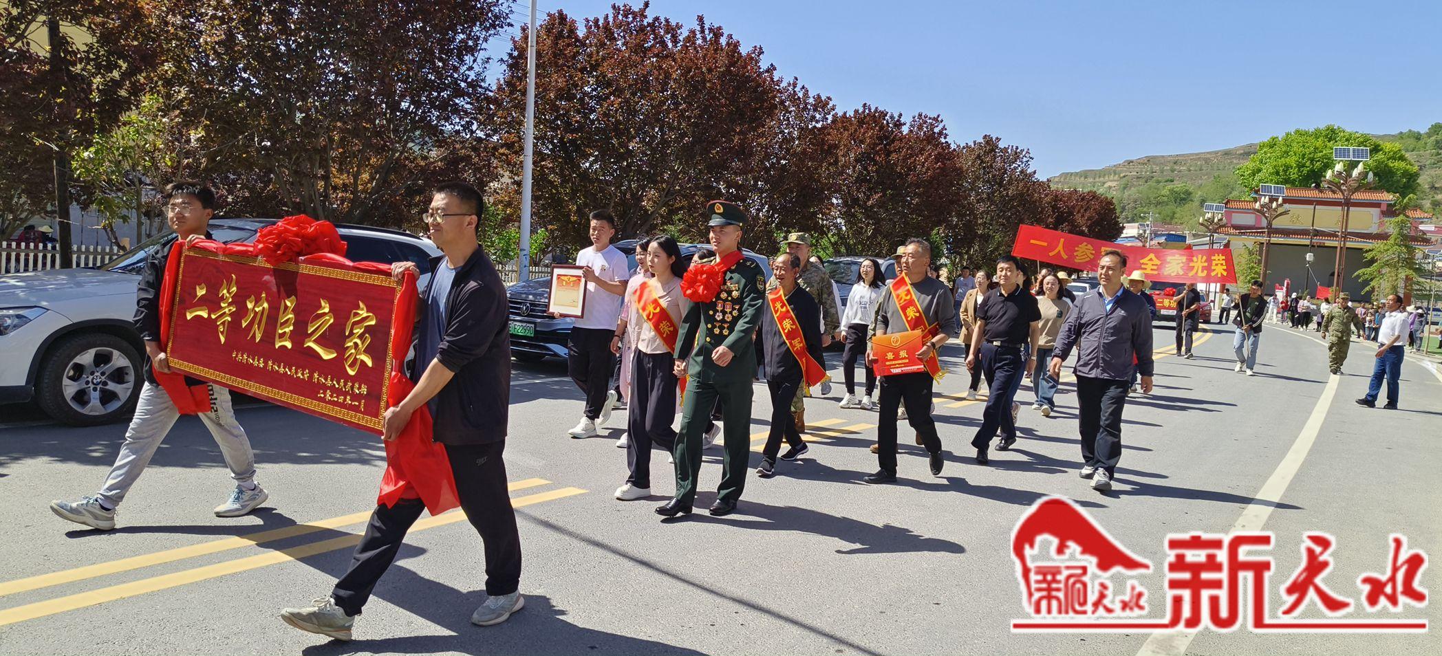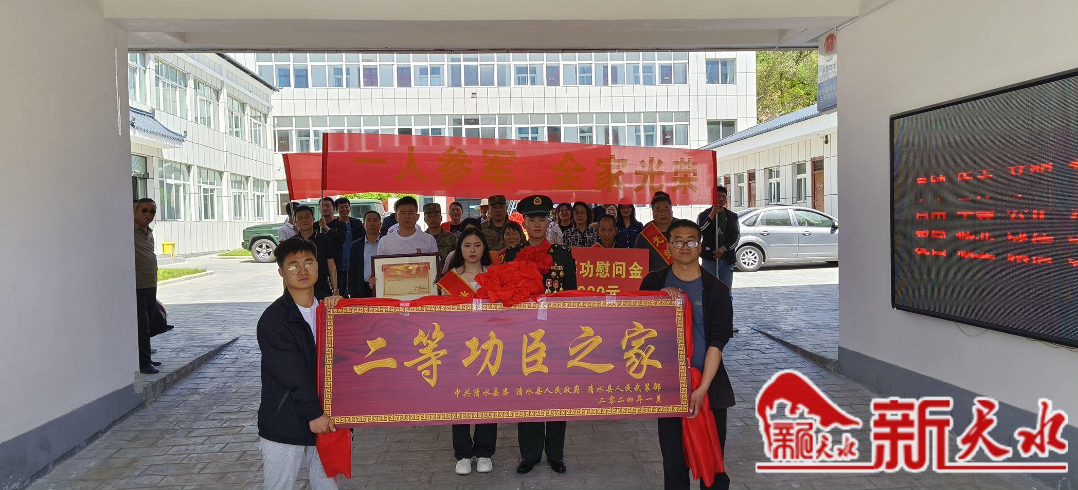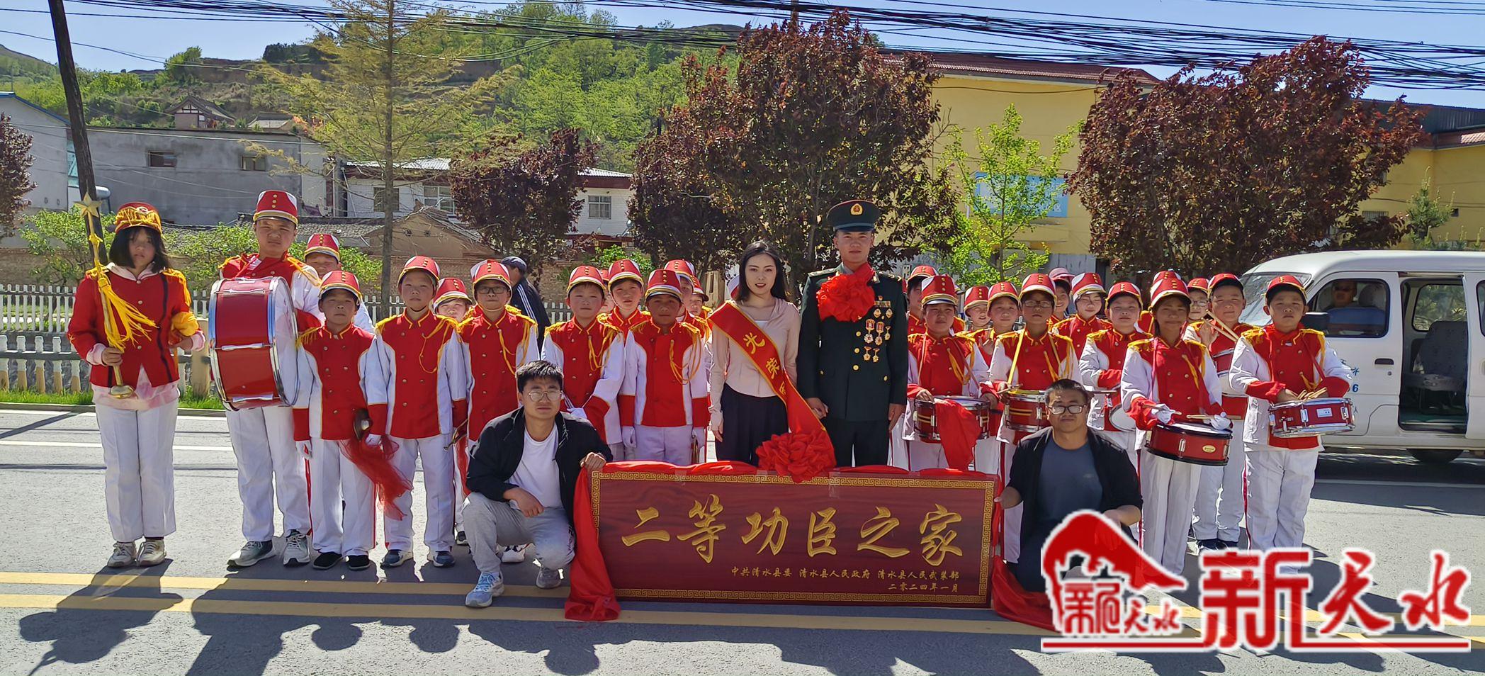 新天水讯【记者王莹】一人立功,家乡光荣。5月13日,清水县王河镇文化广场锣鼓喧天、热闹非凡,县人武部、县退役军人事务局联合王河镇政府,将熠熠生辉的“二等功臣之家”牌匾和大红喜报送往该镇成寺村陈文魁家中,全镇上千名父老乡亲与军属一家共同分享了这份难得的荣耀和喜悦。