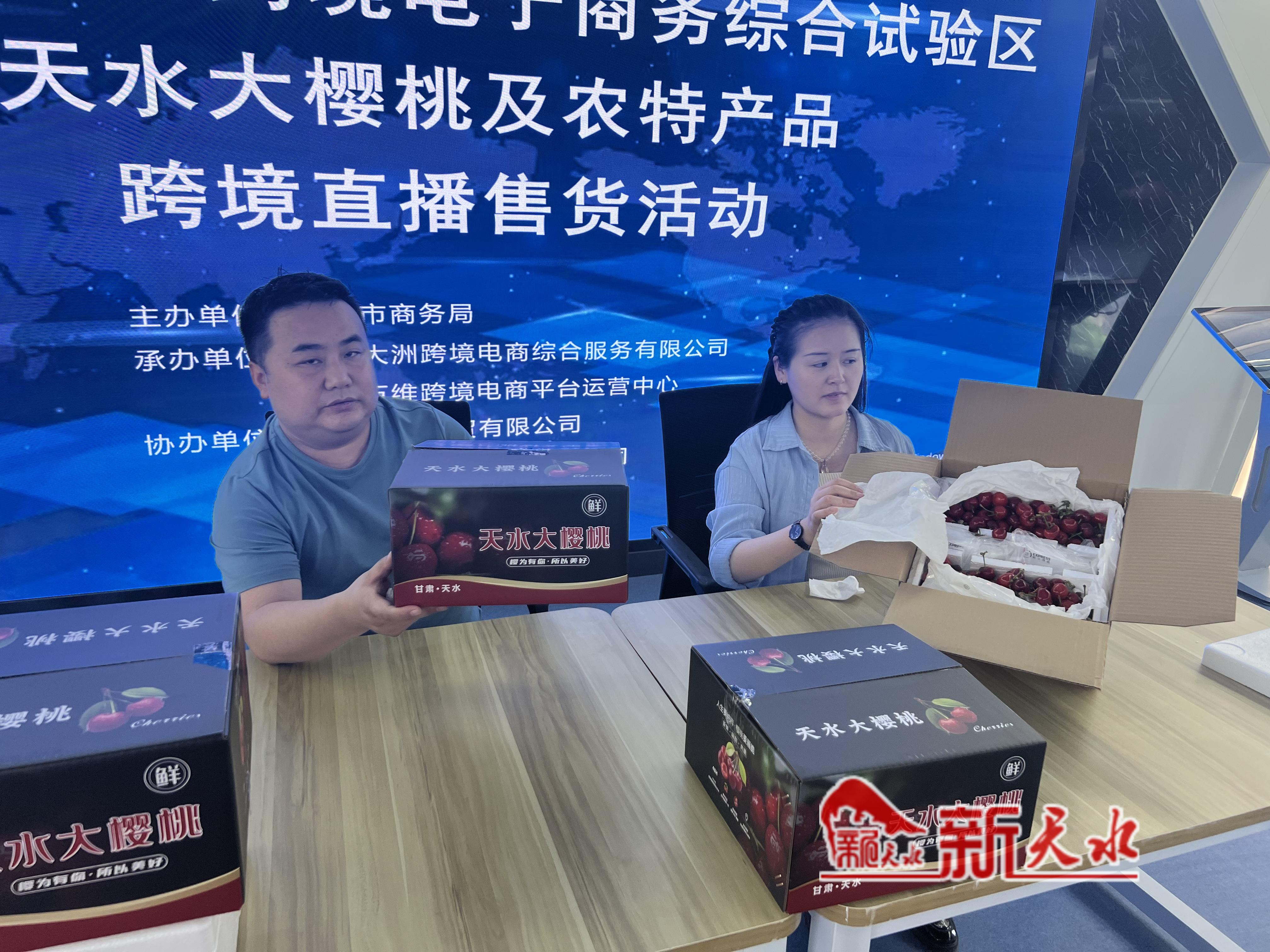 新天水讯【记者范少杰】为加快推动全市外贸提质增效,培育发展全市外贸新业态,扩大天水农特产品销售渠道,5月21日,中国(天水)跨境电子商务综合试验区举行天水大樱桃及农特产品跨境直播售货活动。