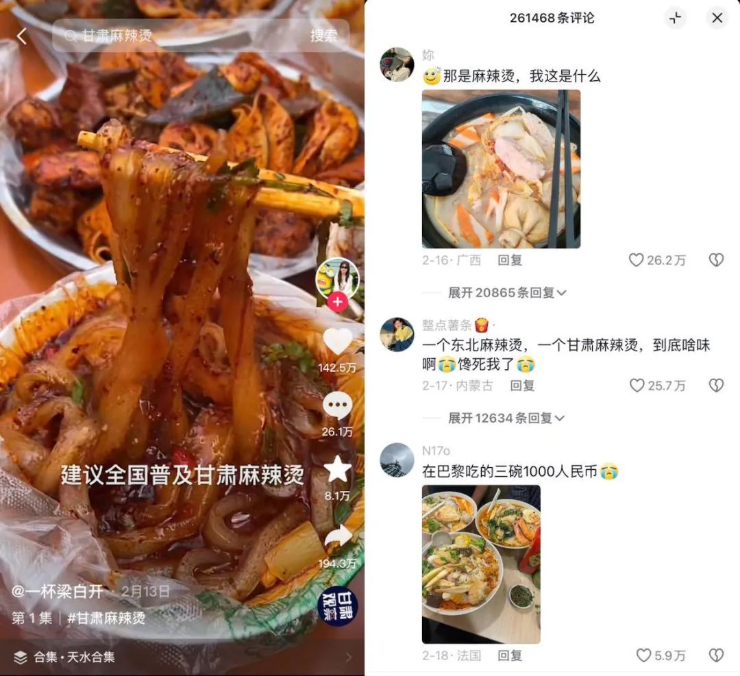 一个大家意想不到的日常食物,成为撬动流量的杠杆。今年一月,“甘肃麻辣烫也太满足了”等话题逐渐成为新一轮抖音热点。春节期间,当地融媒体中心顺势做了一场“看天水社火,吃天水麻辣烫”的直播,在抖音和微信视频号上,获得了超30万的围观量。
