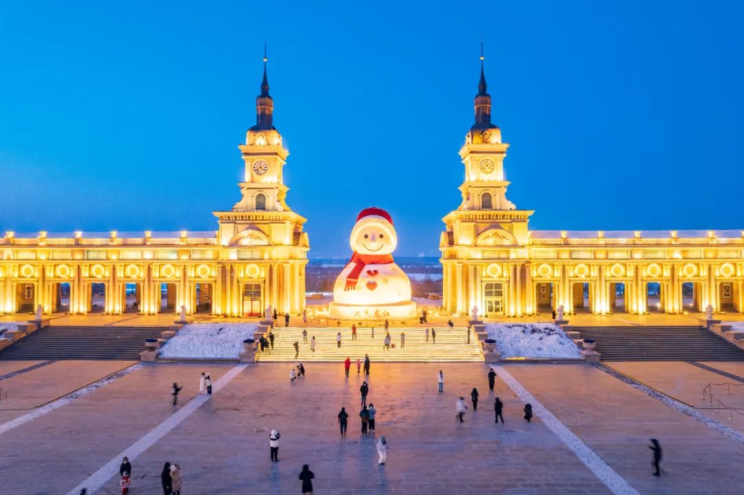 哈尔滨群力音乐公园音乐长廊大雪人夜景