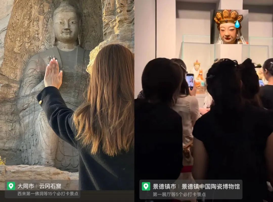 年轻人在云岗石窟与大佛借位击掌,打卡景德镇“无语菩萨”表情包