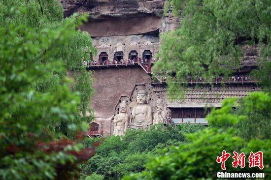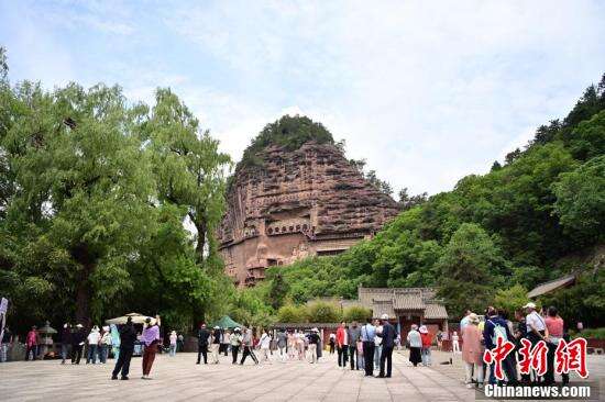 6月4日,甘肃天水,游客在麦积山石窟景区参观。麦积山石窟始建于十六国后秦时期,因延续时间长,造像数量众多、造型优美,被誉为“东方雕塑馆”,是中国四大石窟之一。