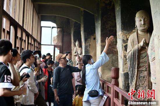 6月4日,甘肃天水,游客在麦积山石窟内参观。麦积山石窟始建于十六国后秦时期,因延续时间长,造像数量众多、造型优美,被誉为“东方雕塑馆”,是中国四大石窟之一。