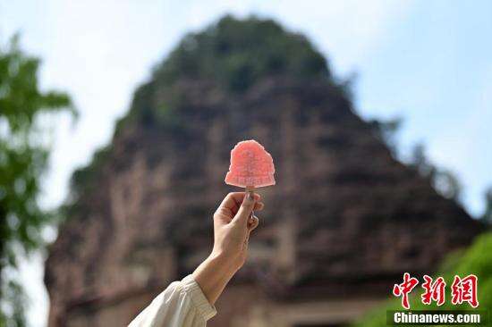 6月4日,甘肃天水,游客在麦积山石窟前展示文创雪糕。麦积山石窟始建于十六国后秦时期,因延续时间长,造像数量众多、造型优美,被誉为“东方雕塑馆”,是中国四大石窟之一。