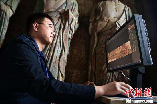 6月4日,甘肃天水,工作人员在麦积山石窟内检查数字化扫描的造像和壁画信息。麦积山石窟始建于十六国后秦时期,因延续时间长,造像数量众多、造型优美,被誉为“东方雕塑馆”,是中国四大石窟之一。