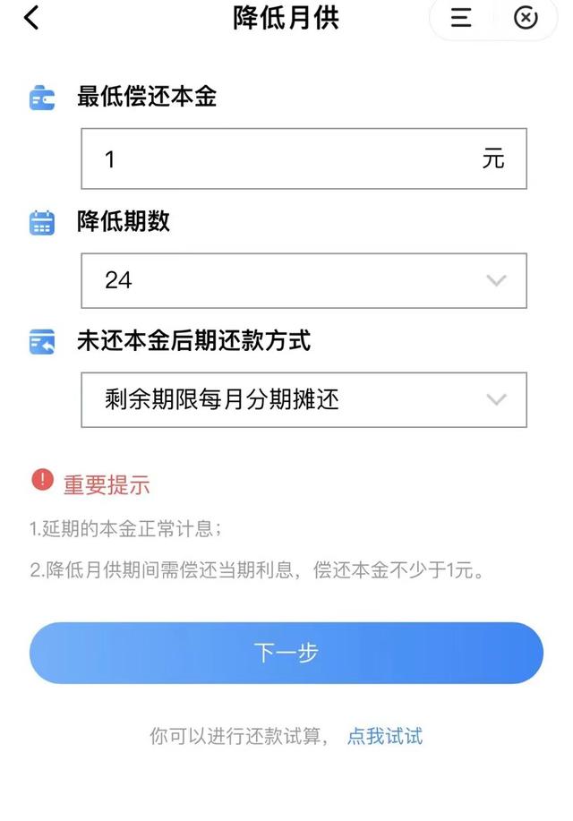 “降低期数只能选择1—24期,未还本金后期还款方式只能选择‘剩余期限每月分期摊还’。” 吴建说,他尝试点击还款试算,但只显示前三期的本金1元+利息,并没有两年后的月供金额。他认为,目前这项业务有些问题还不明确,比如申请后如果LPR下降,还款利息是否也会下降。因此,他暂时并不打算变更还款方案。