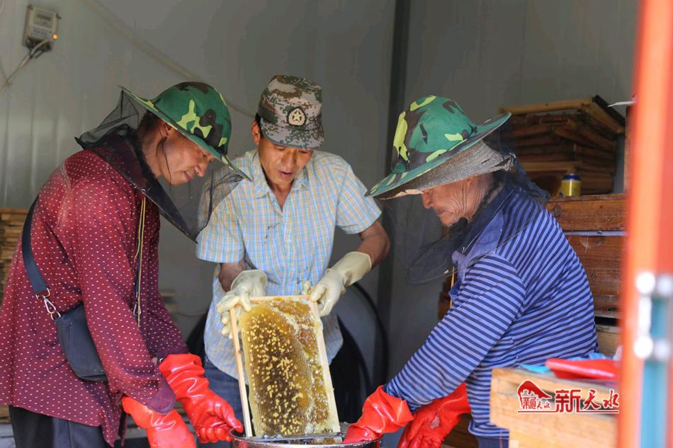 新天水讯【通讯员管秋勇 兰红红】 时下,正值酿蜜时节,蜂农也到了一年中最忙碌的时刻。走进武山县四门镇水洞村、大蒿村等地的养蜂基地内,只见一排排蜂箱在花丛中整齐摆放,成群的蜜蜂围绕着蜂箱飞舞,正忙着酿造甜蜜事业。养殖户娴熟地打开蜂箱,取蜜板、割蜂蜡、摇蜜,浓浓的蜜香味顿时便扑鼻而来。