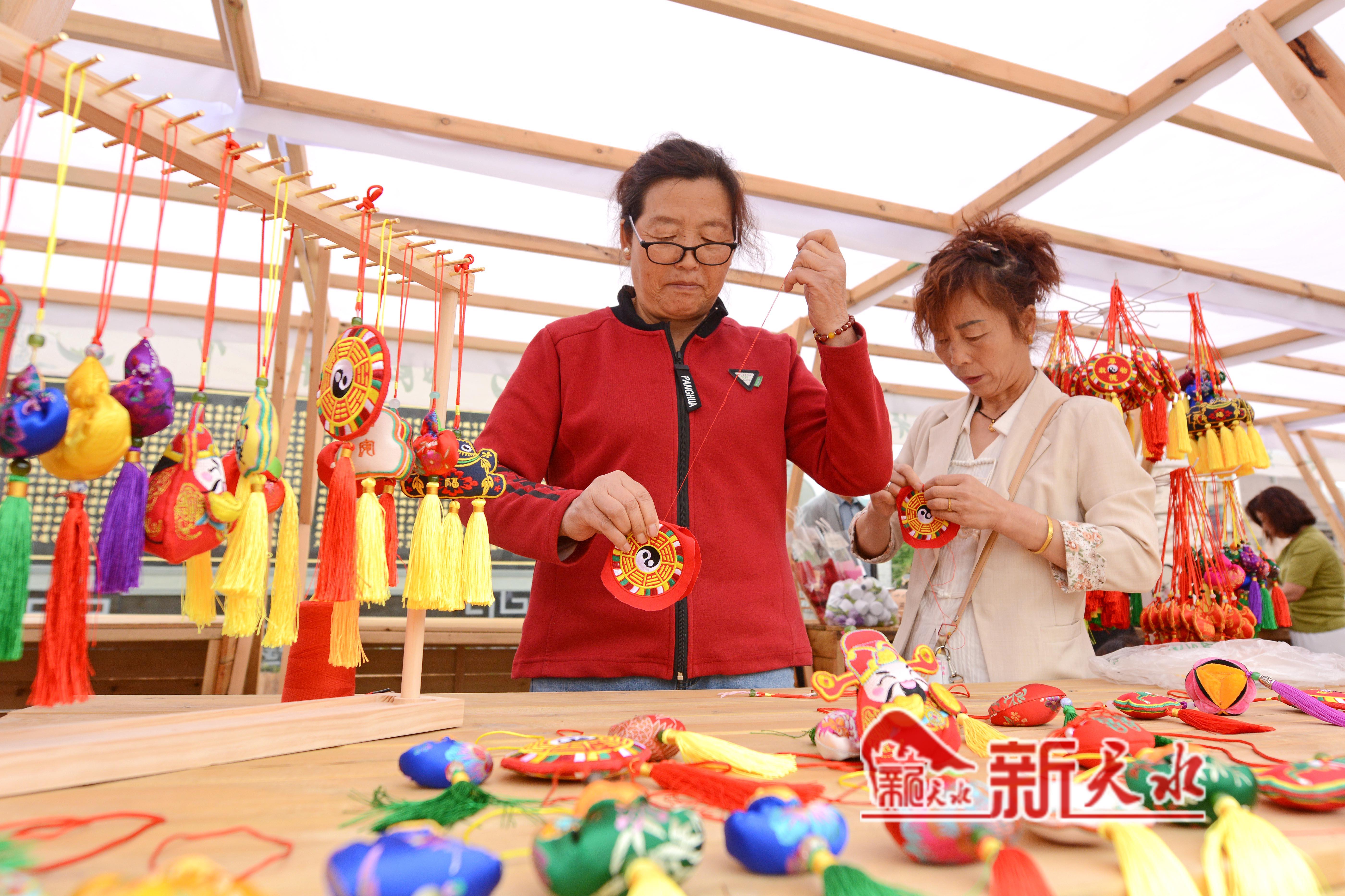 天水古城启汉楼广场的“巧娘集市”里,民间手艺人在缝制传统手工香包。