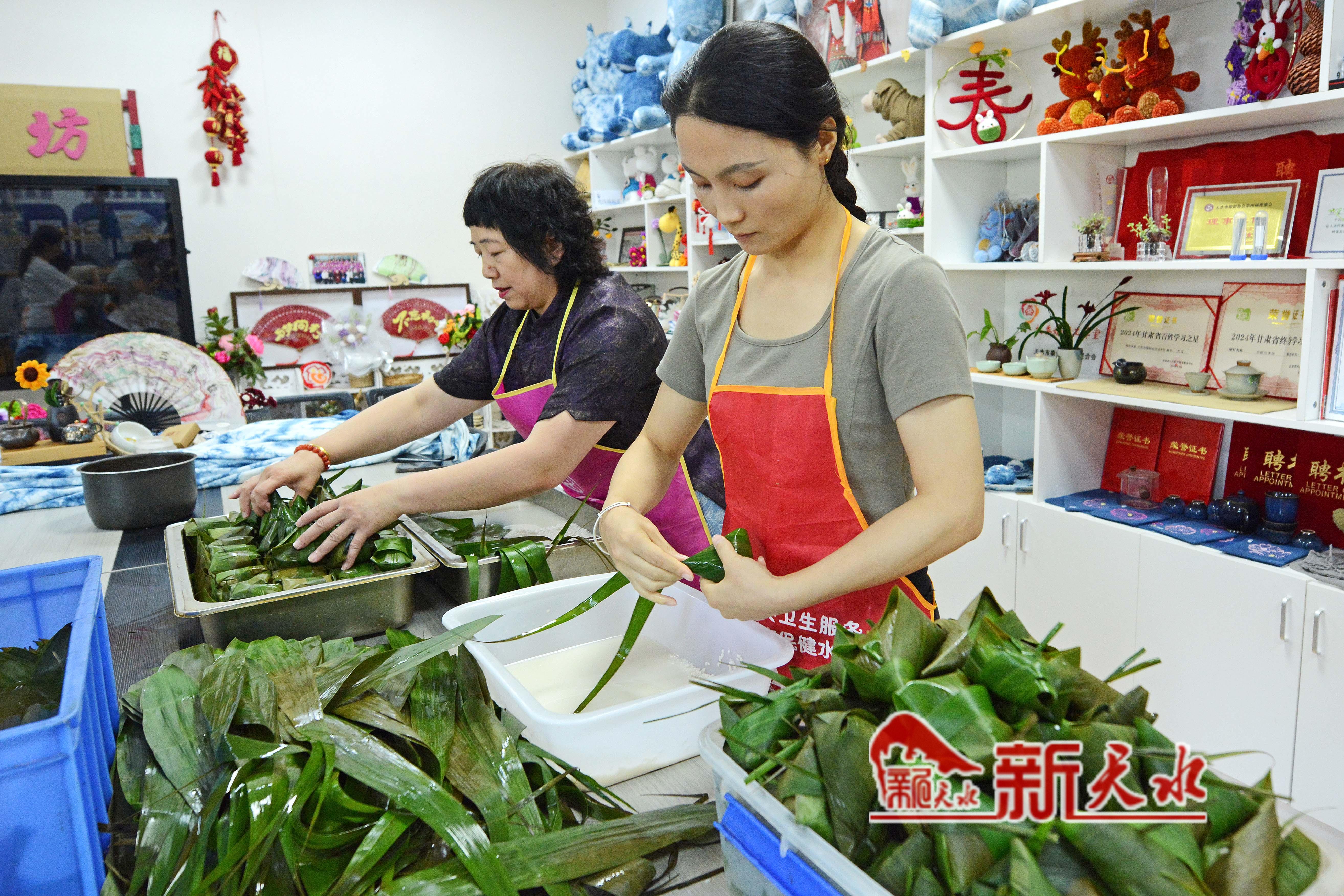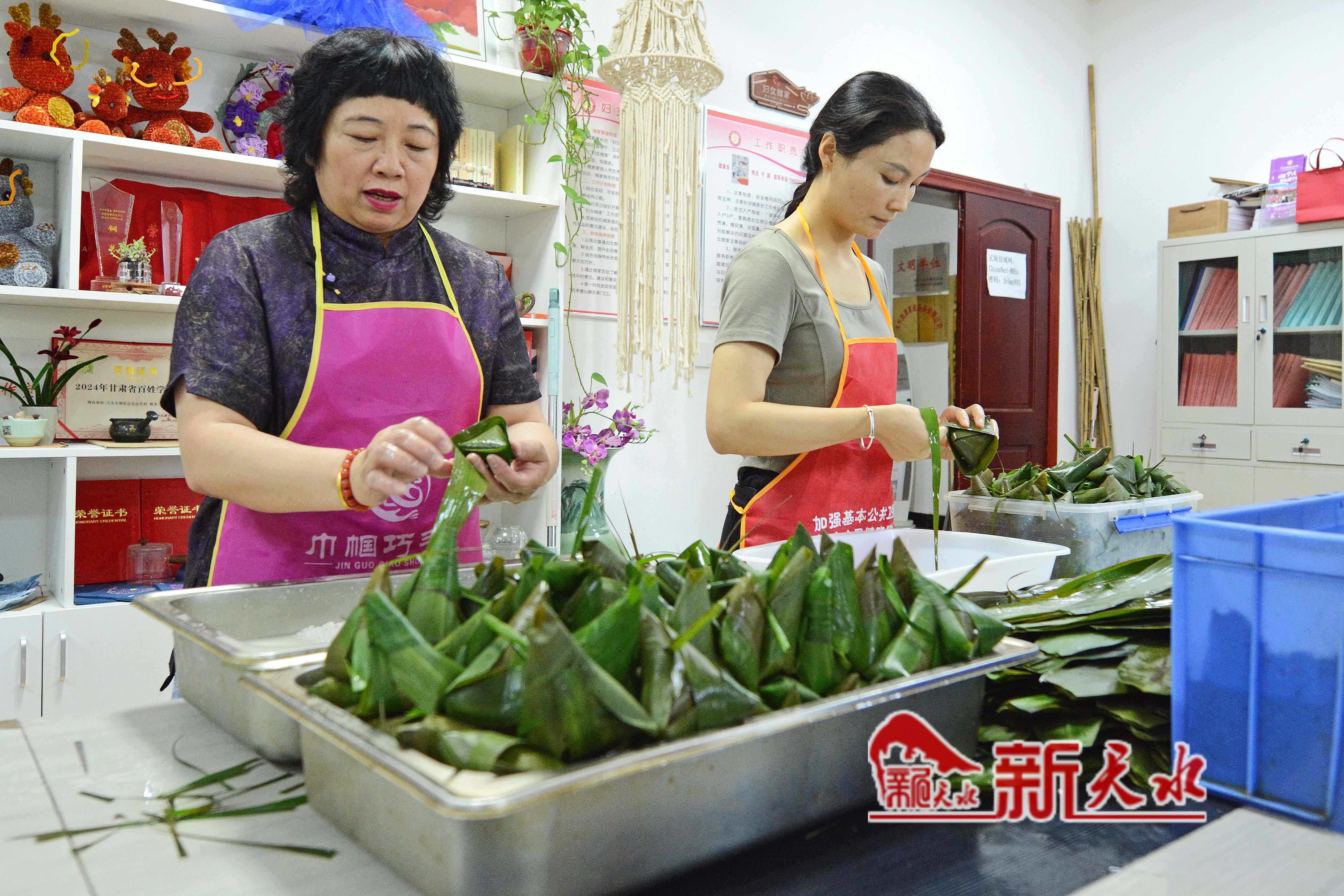 天水巾帼职业培训学校的老师和学员们一手捧米、一手折粽叶,手法娴熟地包着粽子。