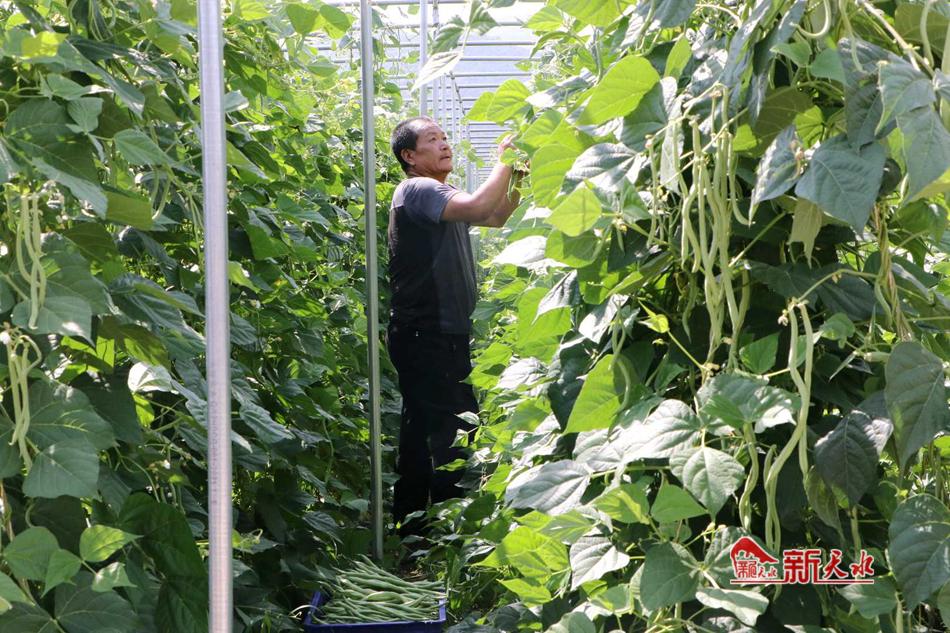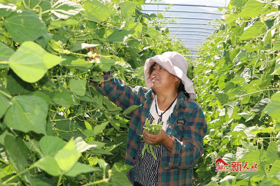 在不远的架豆地里,杨坪村村民刘粉平和老公正忙着摘豆角。“你们是来给我们的豆角拍照的啊!看我们的豆角多长多嫩,你们帮我们好好宣传一下。”刘粉平一边摘豆角,一边招呼大家。 “我家去年种了一亩的架豆,架豆收益在所有农作物中算是最好的,所以今年我就种了3亩。”刘粉平说道。
