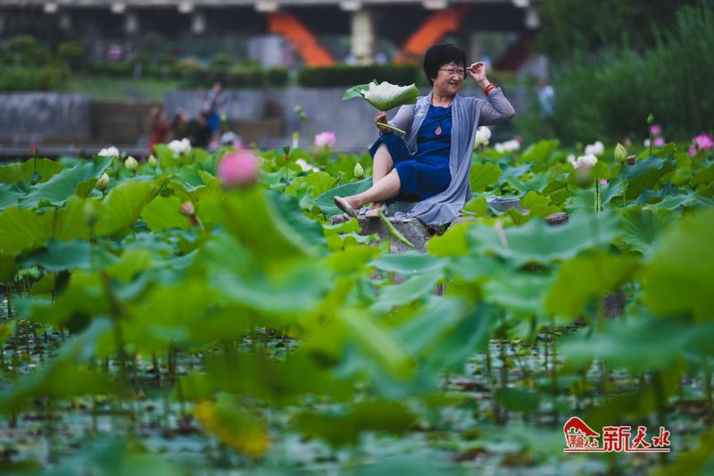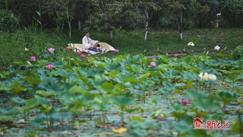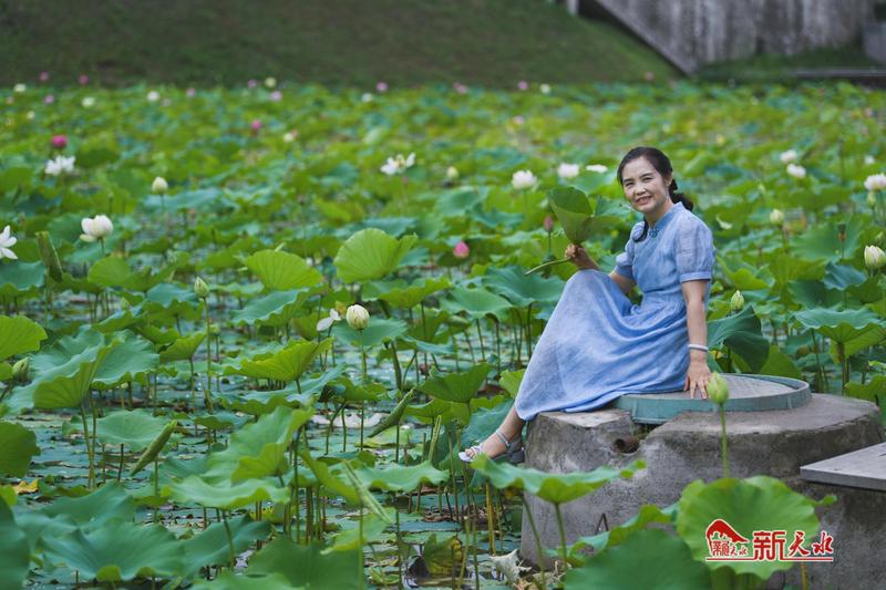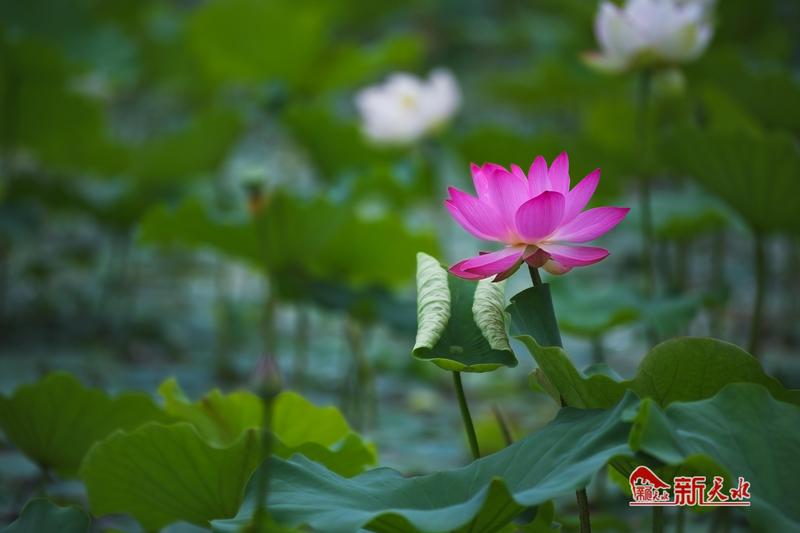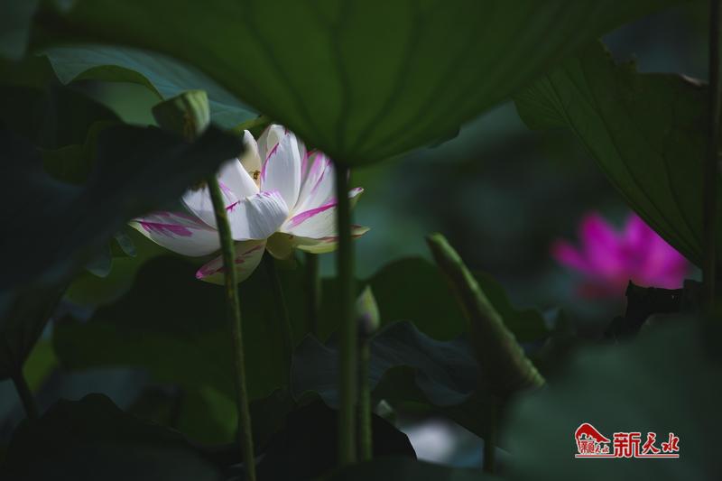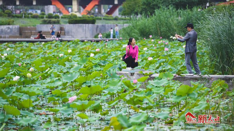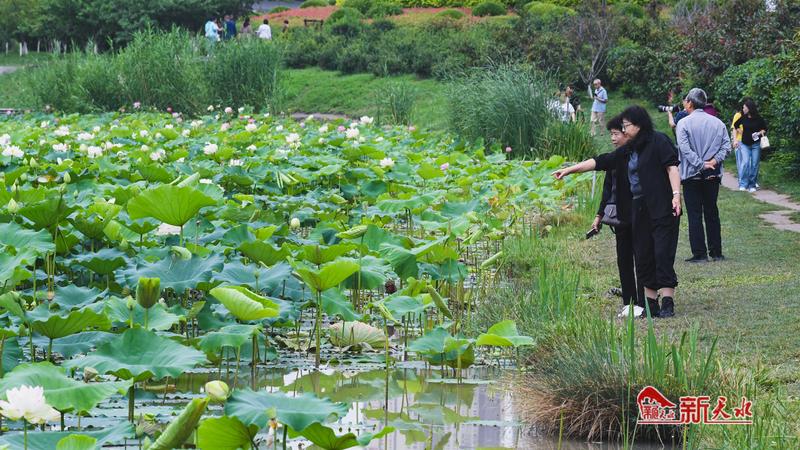 放眼望去,片片荷叶高低错落,朵朵红白相间的荷花或含苞待放、或竞相盛开,在阳光辉映下,显得格外娇艳。娇美灵动的荷花,也吸引了不少慕名而来的游客漫步其中,赏花拍照。