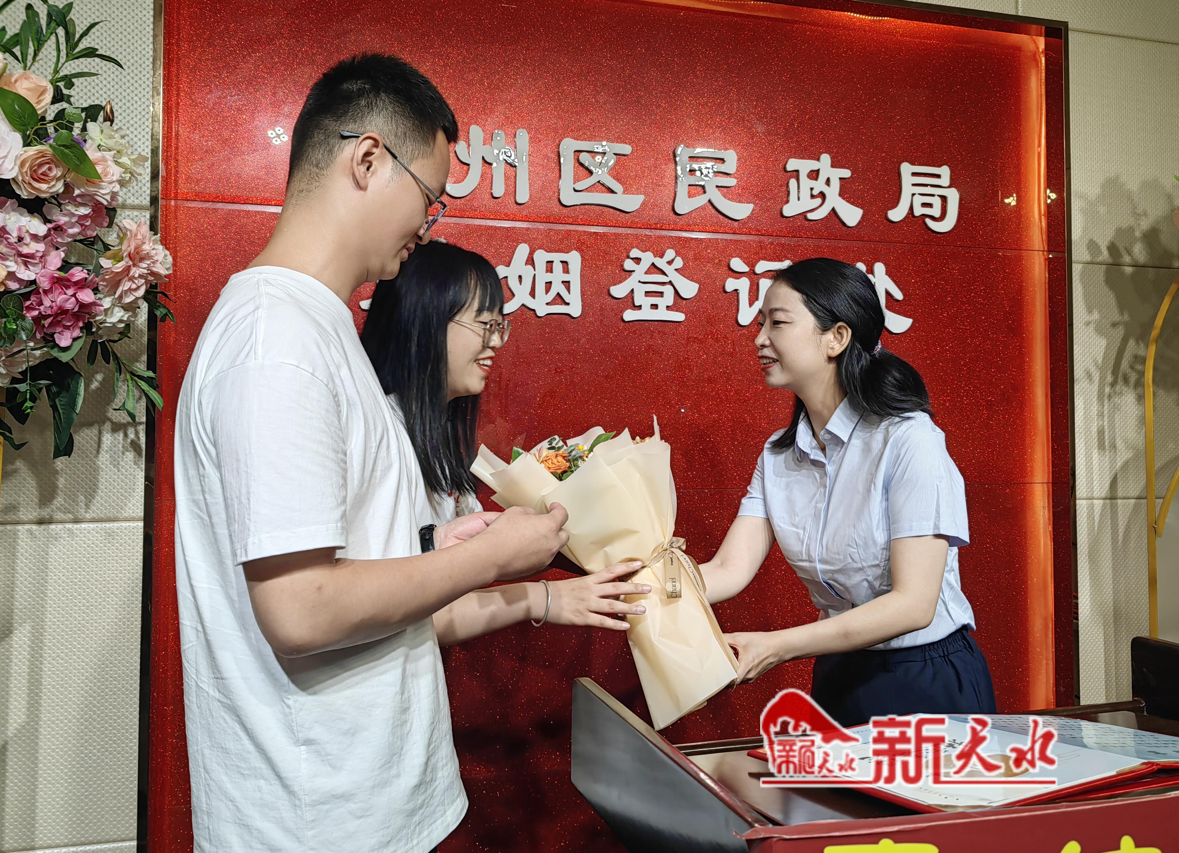 今年“七夕”恰逢星期六,为满足广大新人的结婚登记需求,我市各县区婚姻登记处的工作人员们“为爱加班”,为新人办理结婚登记。