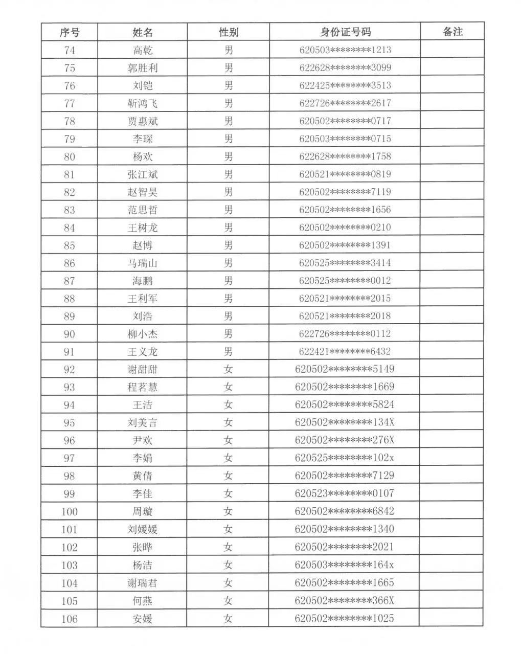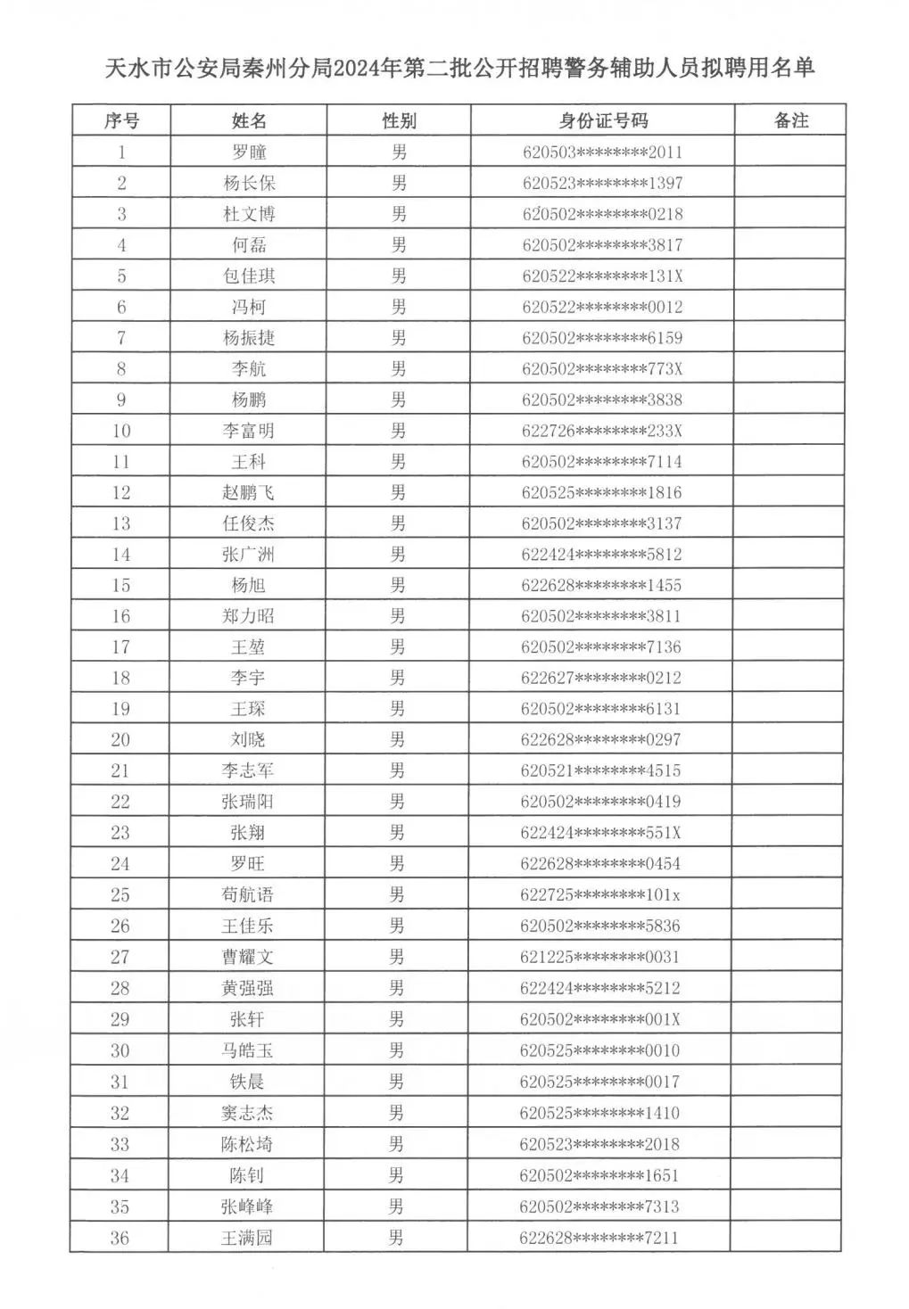 根据2024年7月17日《天水市秦州区人力资源和社会保障局 天水市公安局秦州分局关于公开招聘警务辅助人员的公告》,已由甘肃安博人力资源服务有限公司天水分公司组织完成笔试、体能测评、面试、体检、政审,拟聘用警务辅助人员男性91名、女性15名,现将拟聘用人员名单公示如下,广泛接受社会各界的监督。公示期满后,将按程序办理聘用派遣手续。