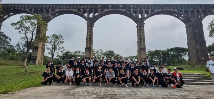 8月12日,云霄县元光中学学生到向东渠事迹纪念馆研学,在世坂渡槽下合影留念,渡槽上镌刻“人定胜天”对联。向东渠事迹纪念馆供图