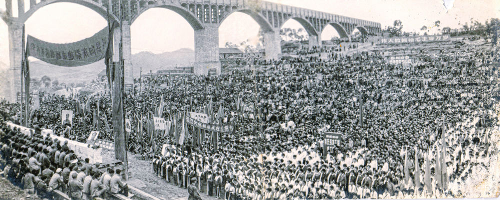 1973年3月12日,在世坂渡槽下举行向东渠通水万人庆祝大会。 杨正允摄