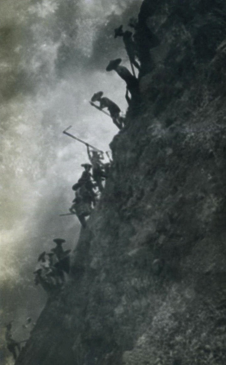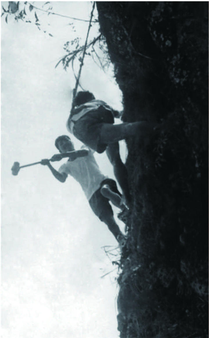 云霄和东山群众在峭壁上冒险开凿炮眼(资料图)。杨正允摄