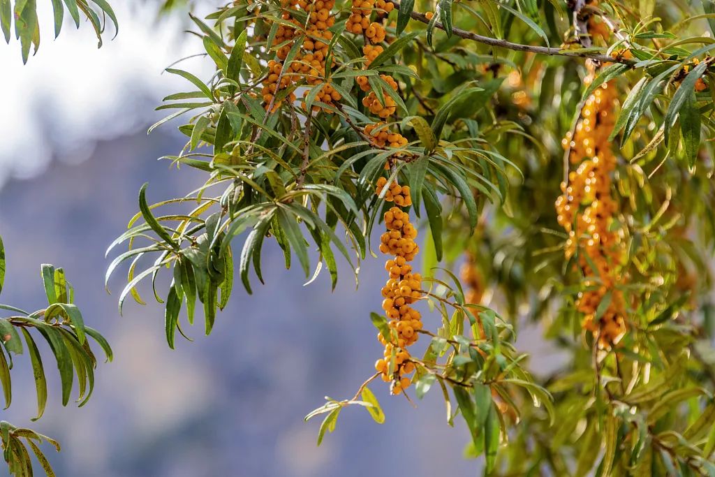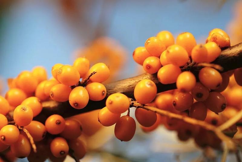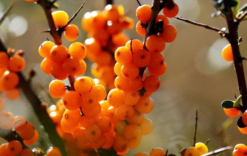 沙棘又名醋柳、酸刺,属胡颓子科沙棘属植物,果实是黄色到橘红色的小浆果,它是地球上最古老的植物之一,被称为植物中的“生命之王”,也是新兴的浆果类果树,有“比熊猫还珍贵的植物”之称。它广泛分布于欧亚大陆的温带地区,我国是世界上天然沙棘种质资源最丰富的国家,也是人工沙棘林面积最大的国家。近几年,沙棘越来越受到人们的关注,相关产品种类也层出不穷。沙棘鲜果的营养价值很高,还被称为“长寿果”“第二人参”,其所含的营养成分很丰富,特别是维生素C、类胡萝卜素、黄酮类物质、原花青素、多糖等营养,与其他水果相比极具优势。沙棘的维生素C含量超级高,《中国食物成分表》中的数据为204毫克/100克。中熟期的沙棘鲜果维生素C含量最高,有文献数据显示,沙棘的维生素C含量变化范围在100~972毫克/100克,这与我们平时吃的橙子相比,沙棘的维生素C最高可达橙子的近30倍呢,这含量可真是太牛了!
