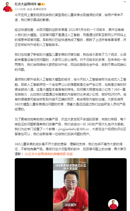 周鸿祎对于上述儿童手表出现错误的问答表示歉意,并表示出现问题的手表是2022年5月的旧版本,“没有装入我们的大模型”,“而是通过抓取互联网公开网站上的信息来回答问题”。对此,360公司已经完成整改,“删除了上述所有有害信息,并正在将软件升级到人工智能版本”。