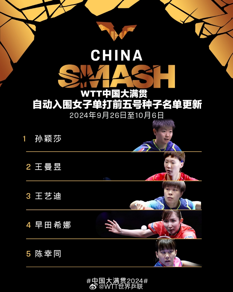据@WTT世界乒联 最新消息:WTT中国大满贯2024自动入围男女单打前五号种子名单更新,中国队球员樊振东、陈梦退出本次比赛。