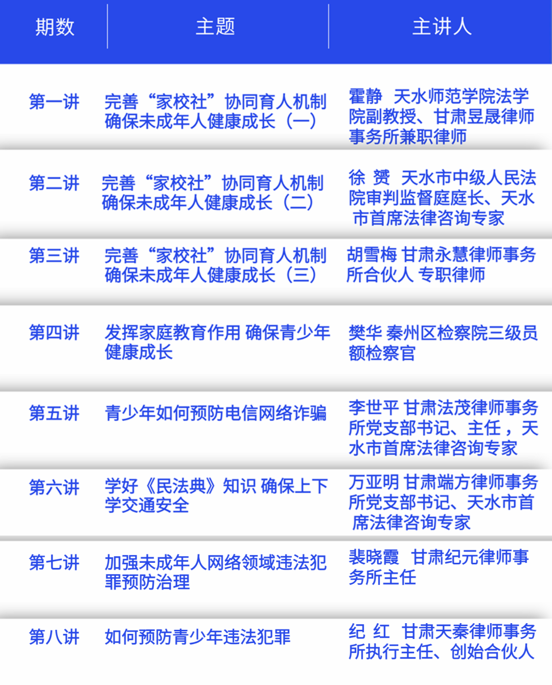 “我们将在全市8所学校逐一开展法治宣讲活动,聚焦交通安全、电信诈骗、校园欺凌等主题,结合线上讲座、线下咨询的方式,增强师生和家长的法治观念与法律意识,为青少年健康成长保驾护航。”天水市法学会秘书长万有太说。
