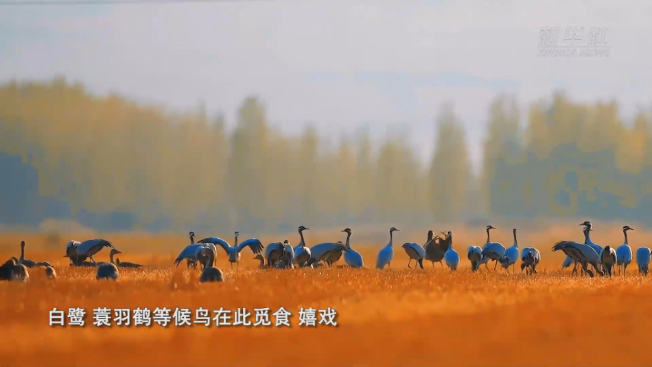 9月,在新疆阿勒泰市一处湿地,白鹭、蓑羽鹤等候鸟在此觅食、嬉戏,与芦苇、农田构成一幅和谐秀美的生态画卷。