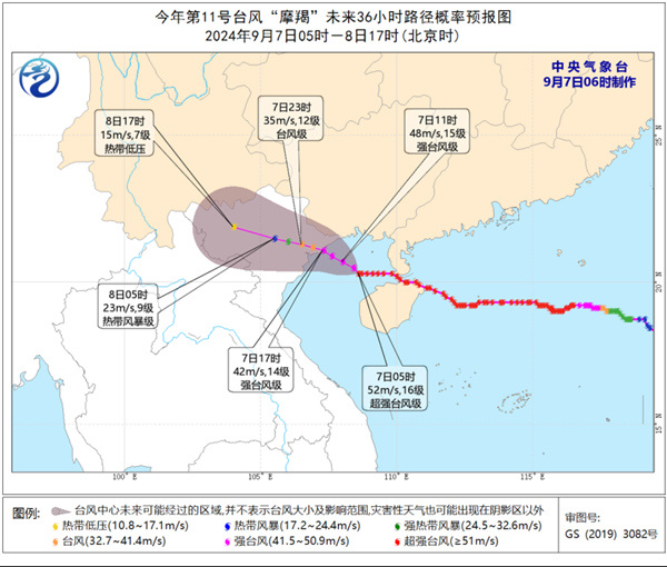 今晨5时,登陆后的“摩羯”仍保持较好的螺旋结构,其中心位于北部湾海面上。预计,“摩羯”将以每小时10—15公里的速度向西偏北方向移动,强度缓慢减弱,逐渐向越南东北部至中越交界一带沿海靠近,并有可能于今天下午至夜间在上述沿海登陆(42~48米/秒,强台风级),登陆后将继续西行,强度逐渐减弱。