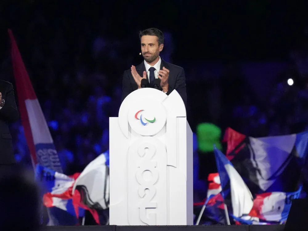 ↑ 巴黎奥组委主席托尼·埃斯坦盖在闭幕式上讲话。新华社记者 才扬 摄