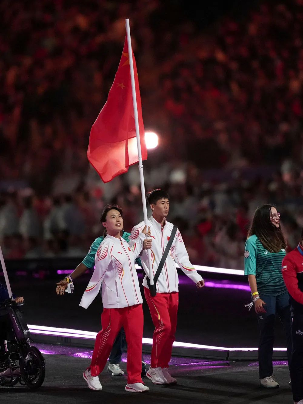 ↑中国体育代表团旗手残奥田径运动员邸东东(右)和残奥游泳运动员蒋裕燕在闭幕式上入场。新华社记者 黄伟 摄
