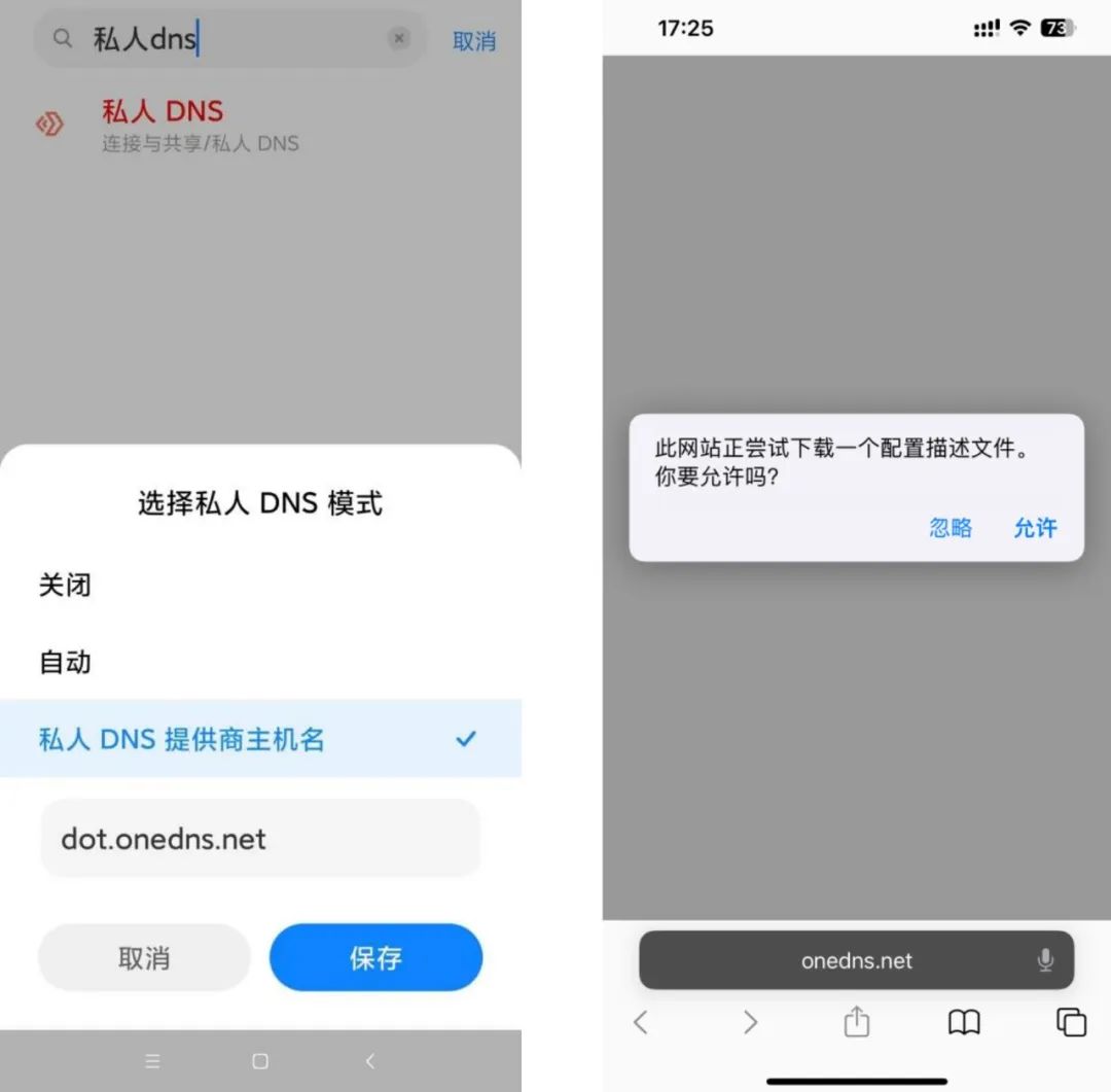 左安卓手机设置私人DNS 右苹果手机下载描述文件设置加密DNS