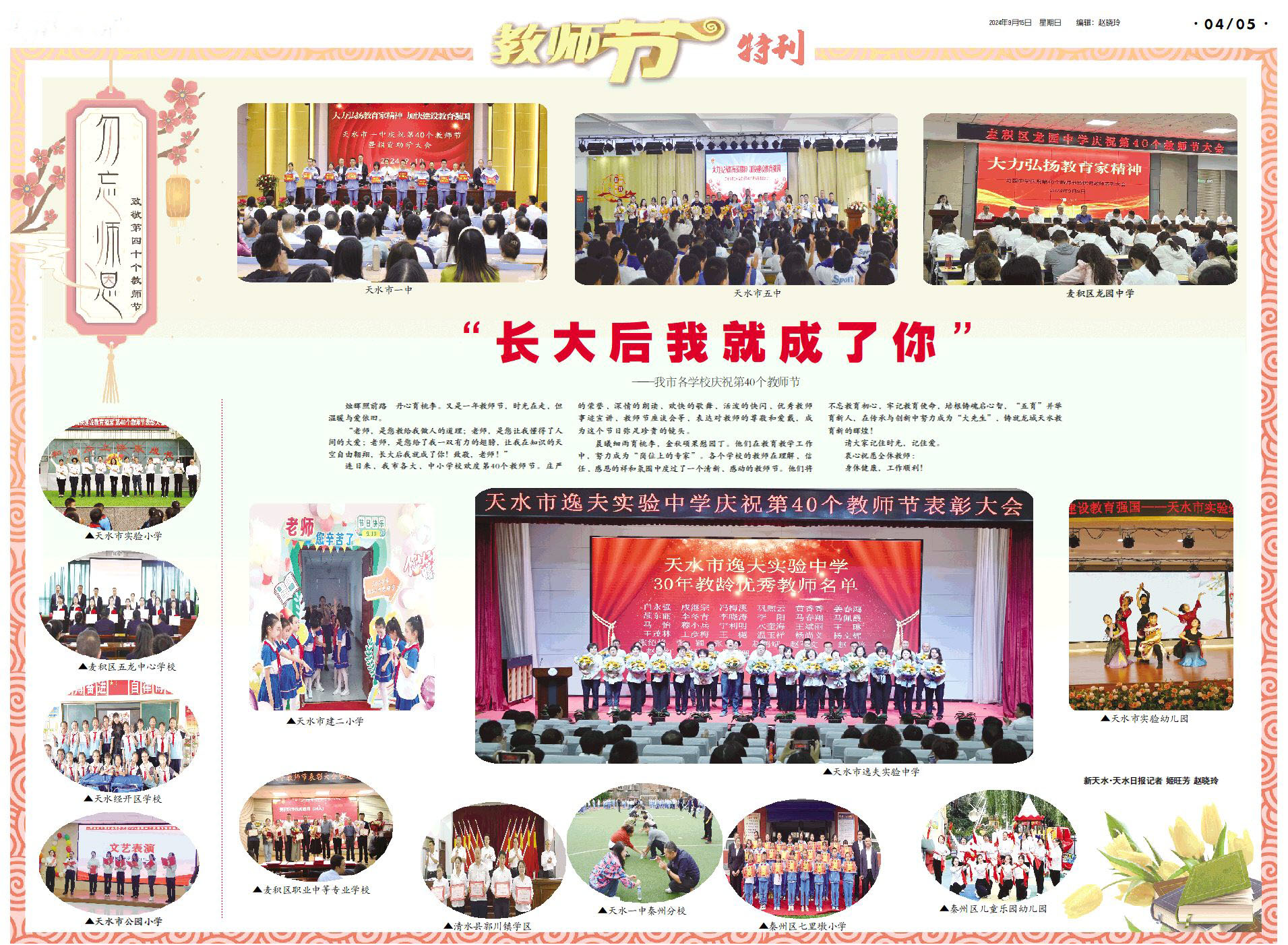 各个学校的全体教师在理解、信任、感恩的祥和氛围中度过了一个清新、感动的教师节。他们将不忘教育初心,牢记教育使命,培根铸魂启心智,“五育”并举育新人,在传承与创新中努力成为“大先生”,铸就龙城天水教育新的辉煌!
