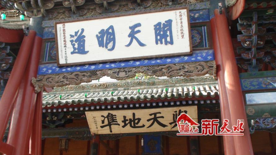 “开天明道”,悬于天水伏羲庙大门前牌坊正中。长3.5米,宽1.25米,厚0.12米。素边,匾心白底蓝字,上下款朱书。此匾有双上款和双下款。第一个上款为“乾隆辛酉孟秋既望”,下款为“湟中观察使者辽海杨应琚薰沐敬书”;第二个上款为“嘉庆十二年岁次丁卯五月吉旦”,下款为“中宪大夫宁夏府知府候补知秦州事王公重建”。