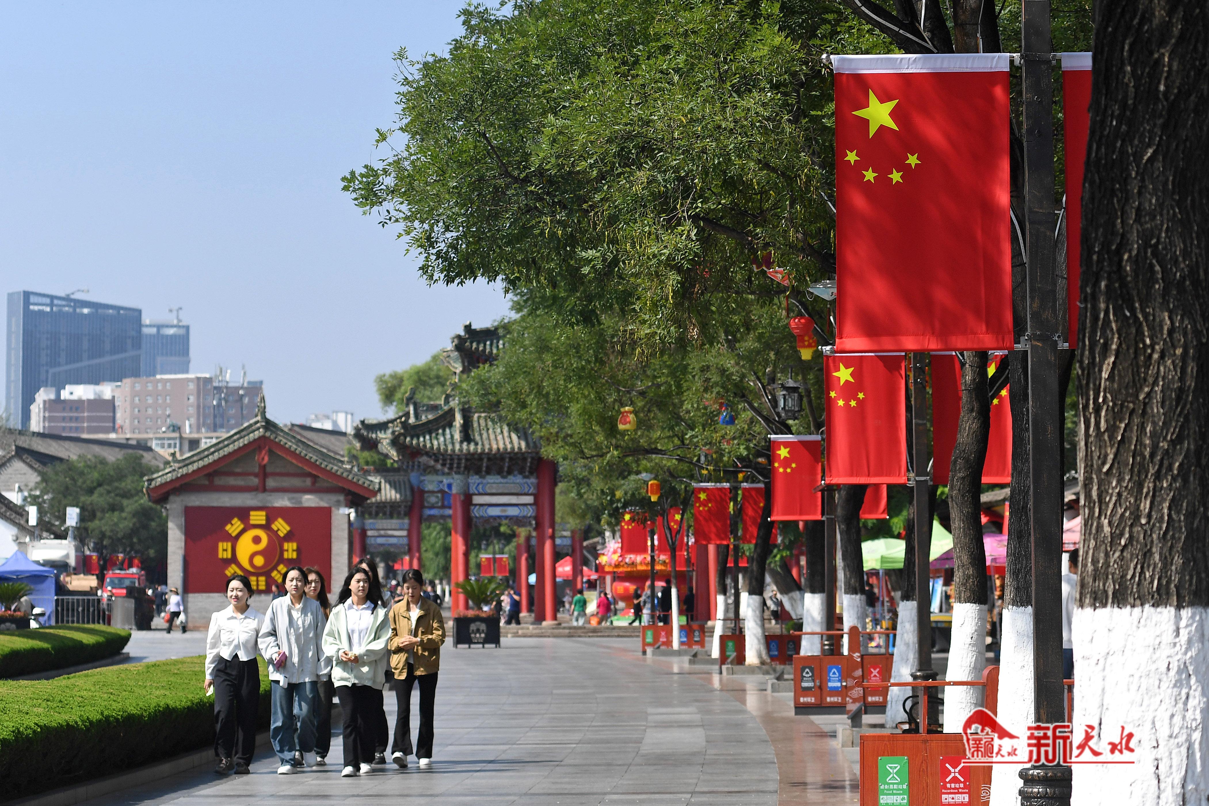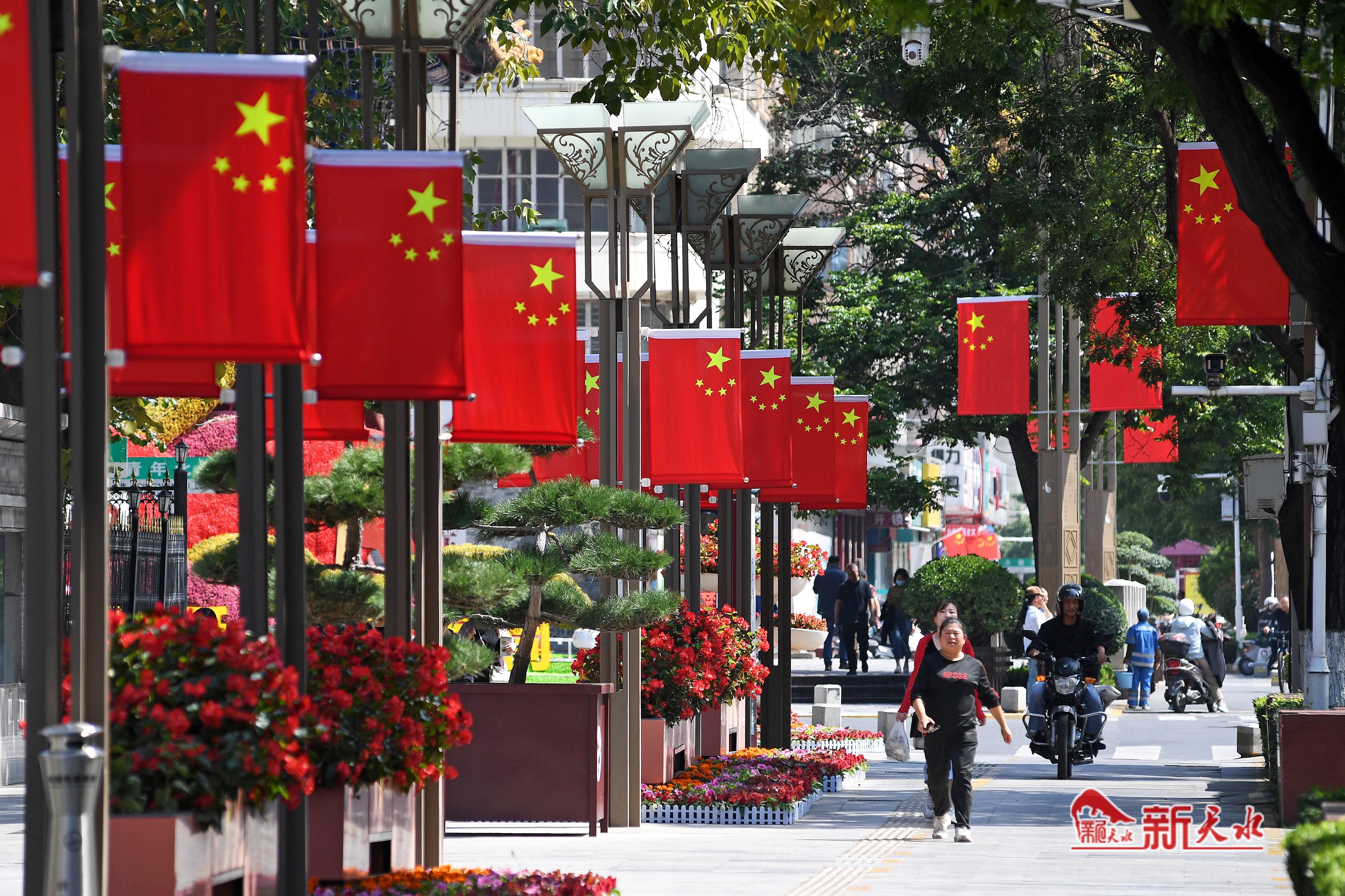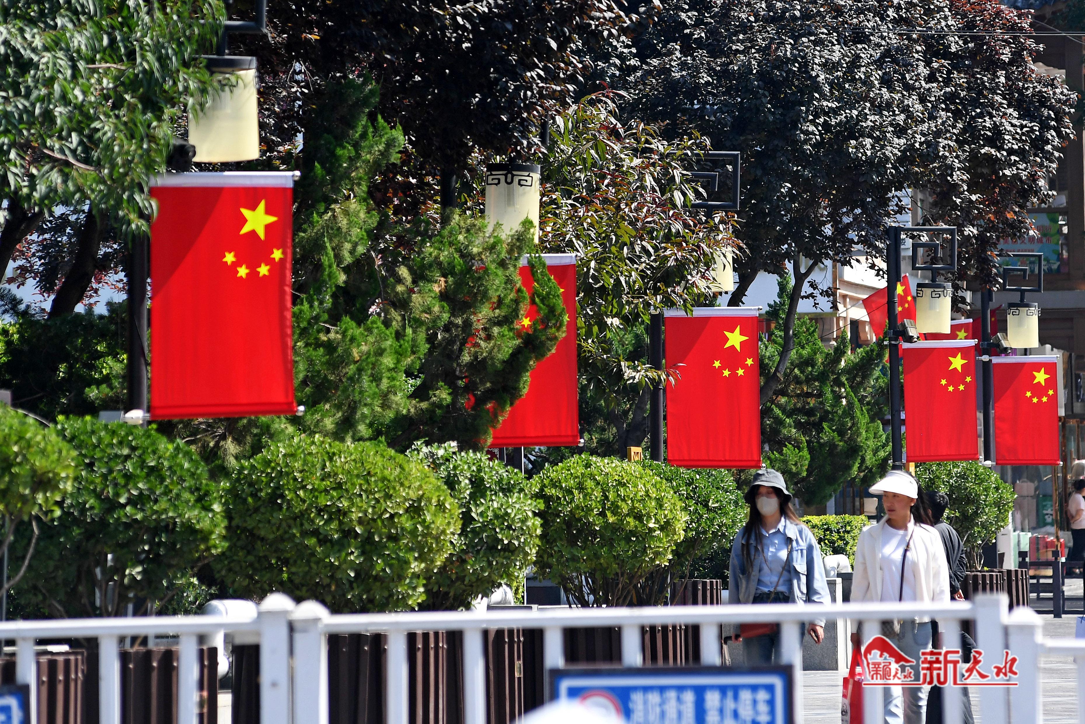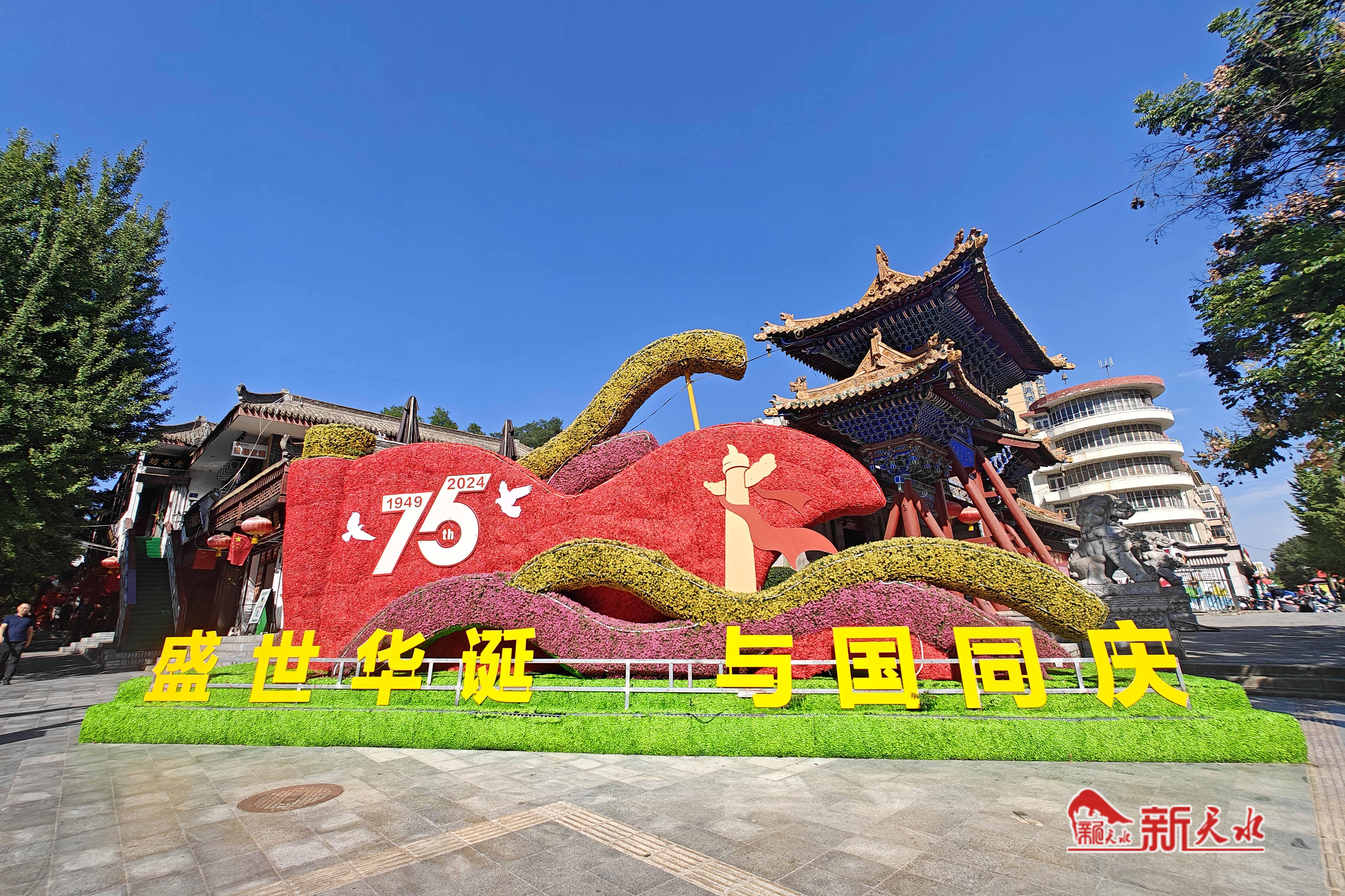 9月23日,工作人员在秦州区藉河北路安装“国庆”灯箱。灯箱一侧是五星红旗,另一侧标注的数字“75”和“盛世华诞“字样喜庆而醒目。国庆节临近,秦州区在城区各条街道和伏羲城、天水古城悬挂起五星红旗。过街天桥上"热烈庆祝中华人民共和国成立75周年"的横幅引人注目。精心布置的花坛景观吸引市民驻足拍照……天水处处洋溢着喜庆祥和的国庆氛围。新天水记者 孙镇 摄