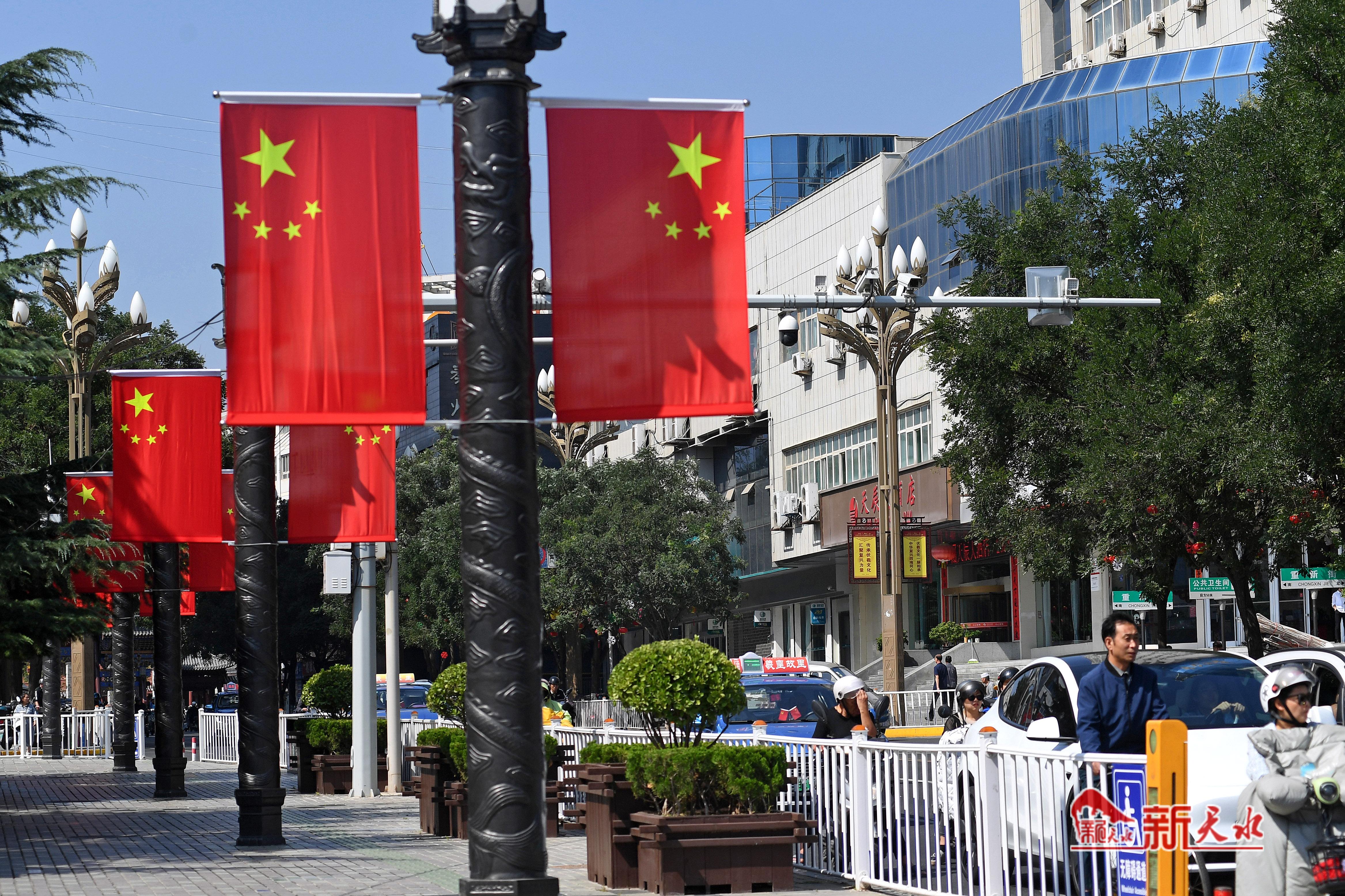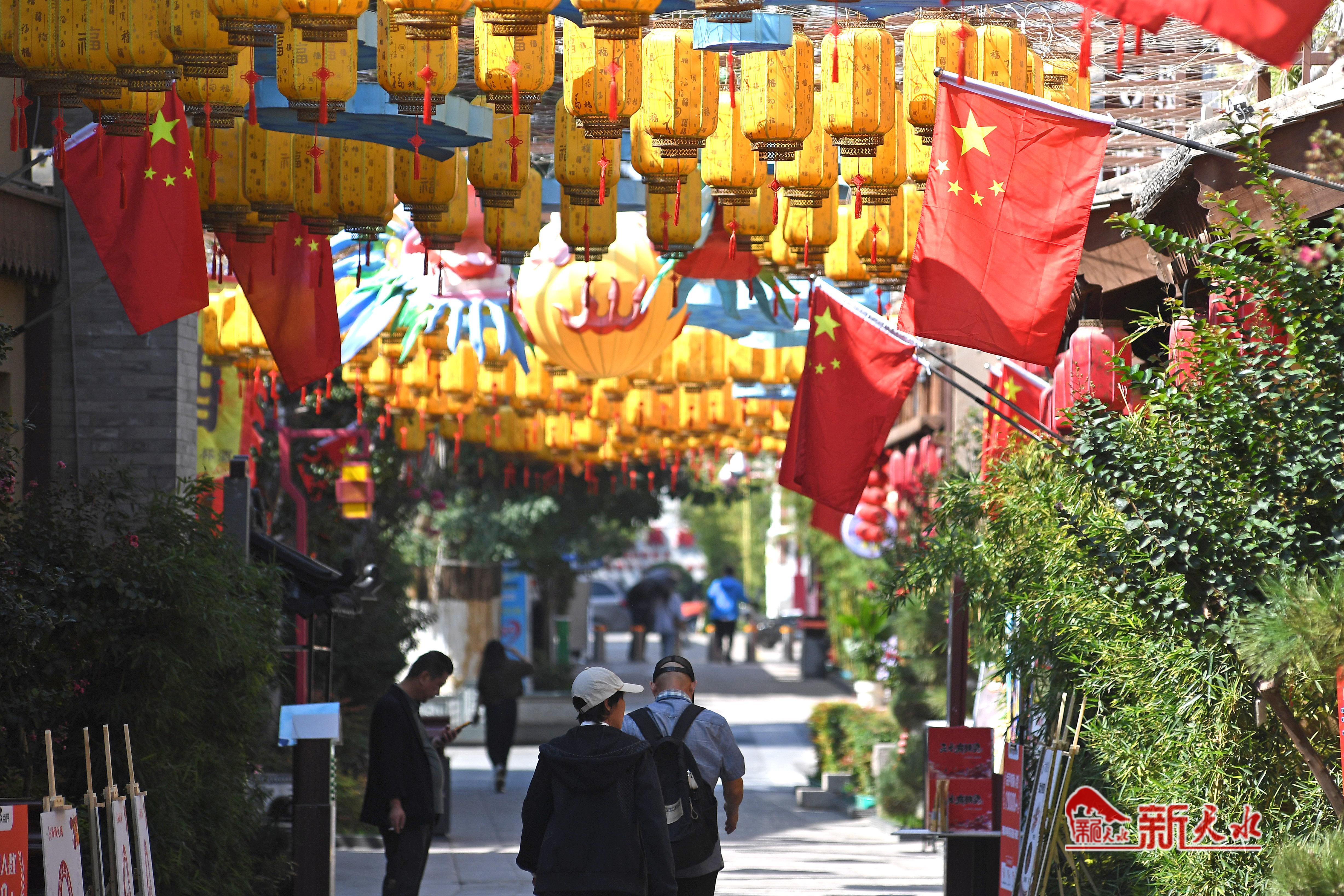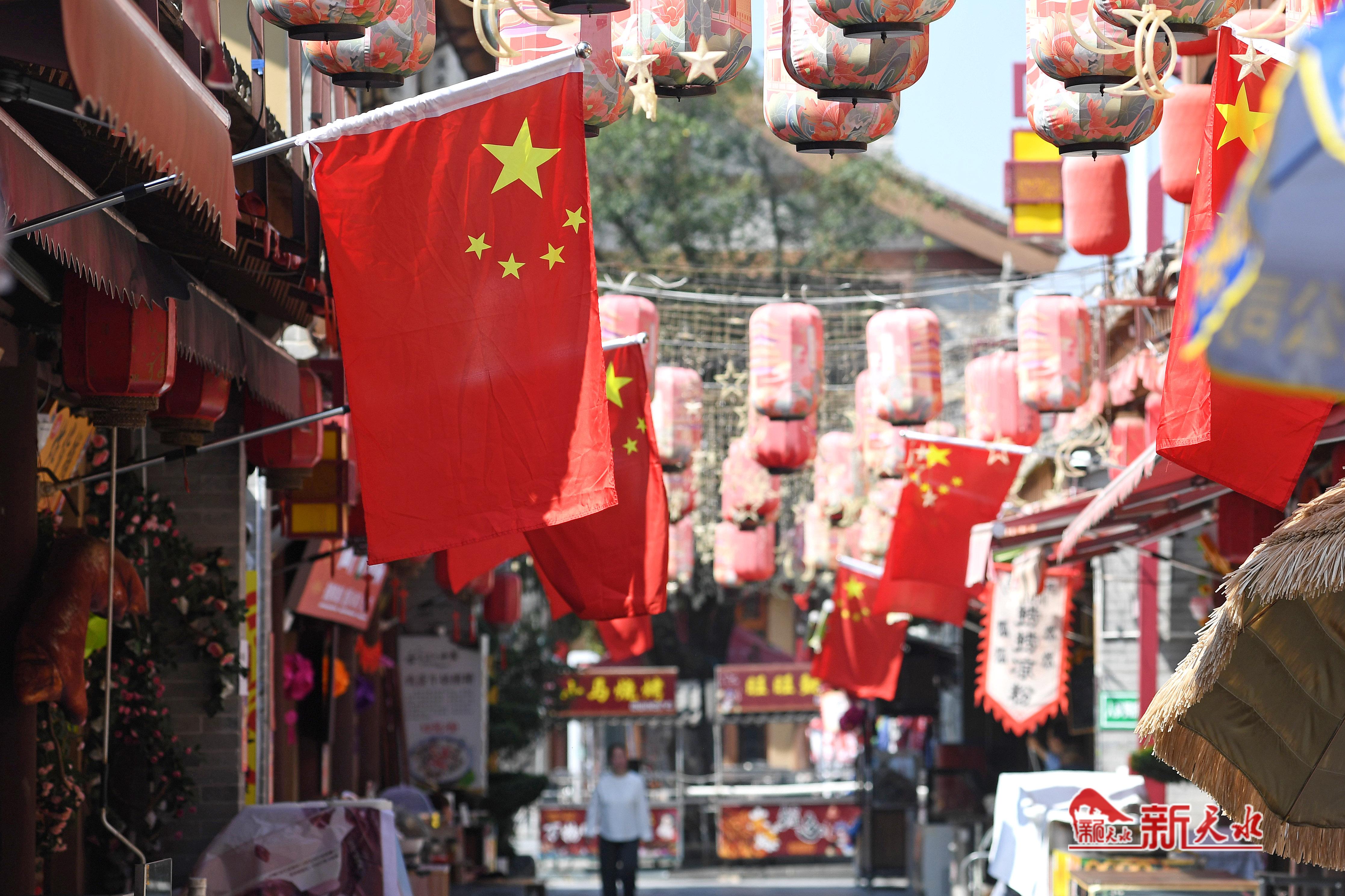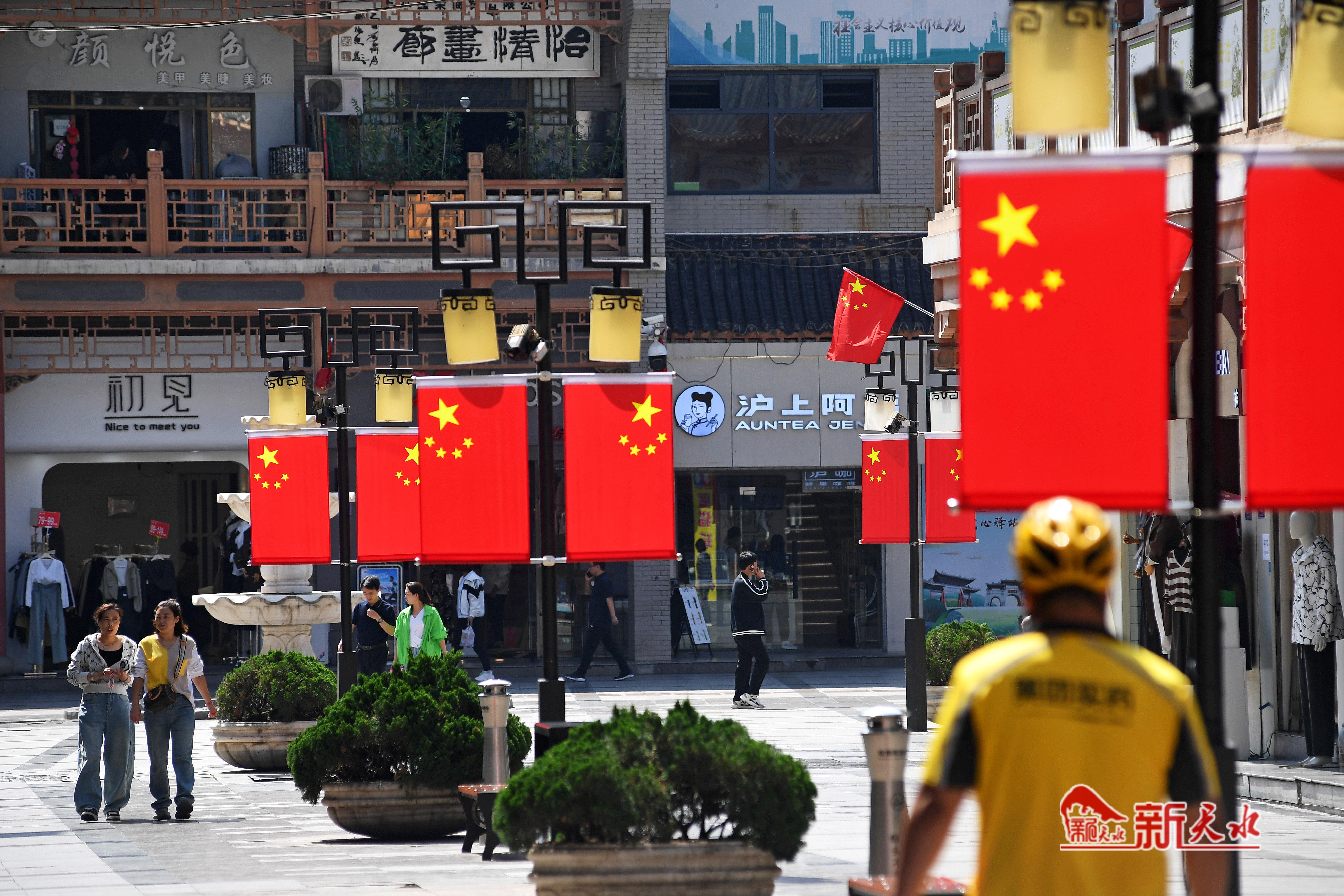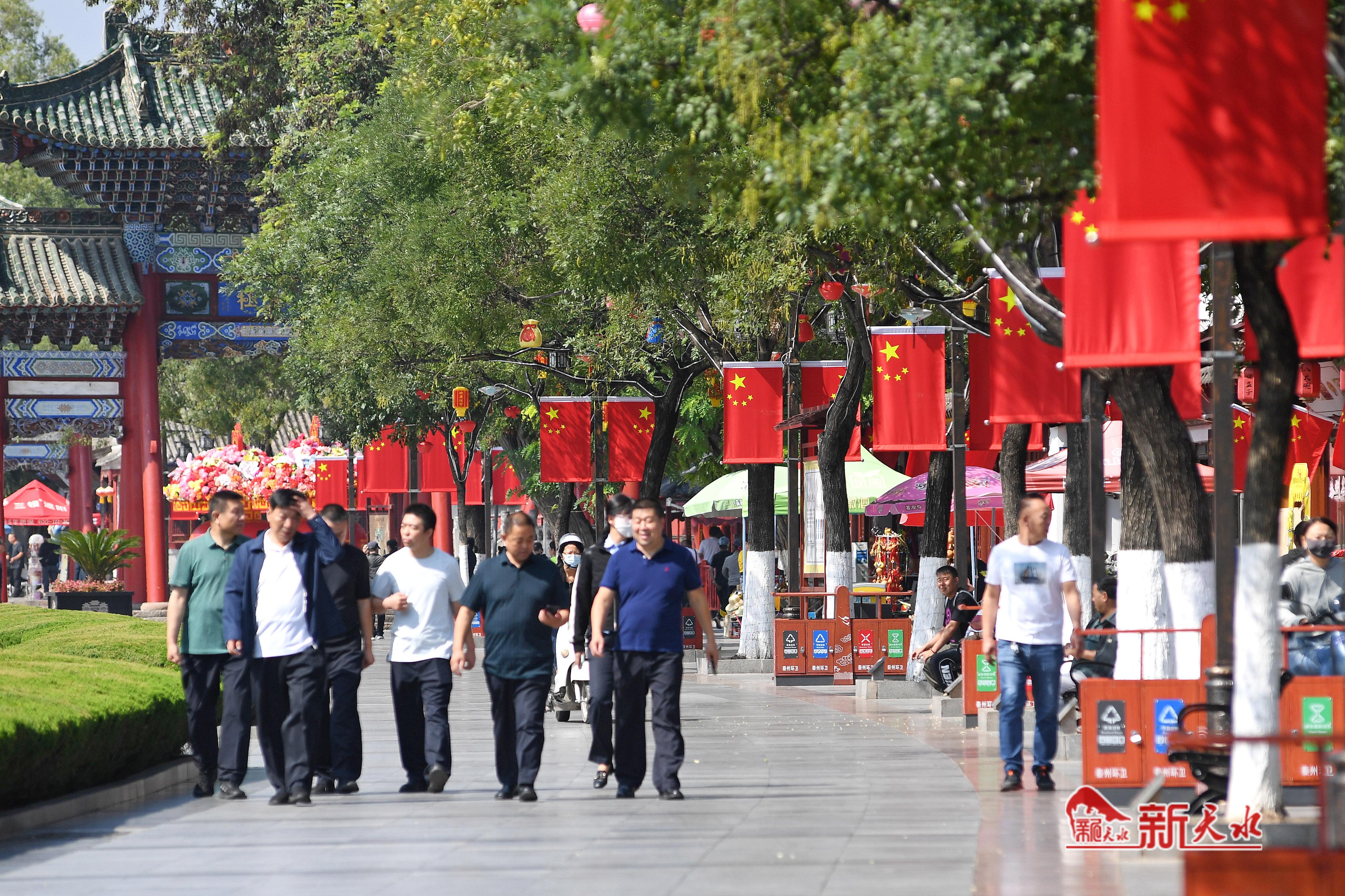 9月23日,工作人员在秦州区藉河北路安装“国庆”灯箱。灯箱一侧是五星红旗,另一侧标注的数字“75”和“盛世华诞“字样喜庆而醒目。国庆节临近,秦州区在城区各条街道和伏羲城、天水古城悬挂起五星红旗。过街天桥上"热烈庆祝中华人民共和国成立75周年"的横幅引人注目。精心布置的花坛景观吸引市民驻足拍照……天水处处洋溢着喜庆祥和的国庆氛围。新天水记者 孙镇 摄