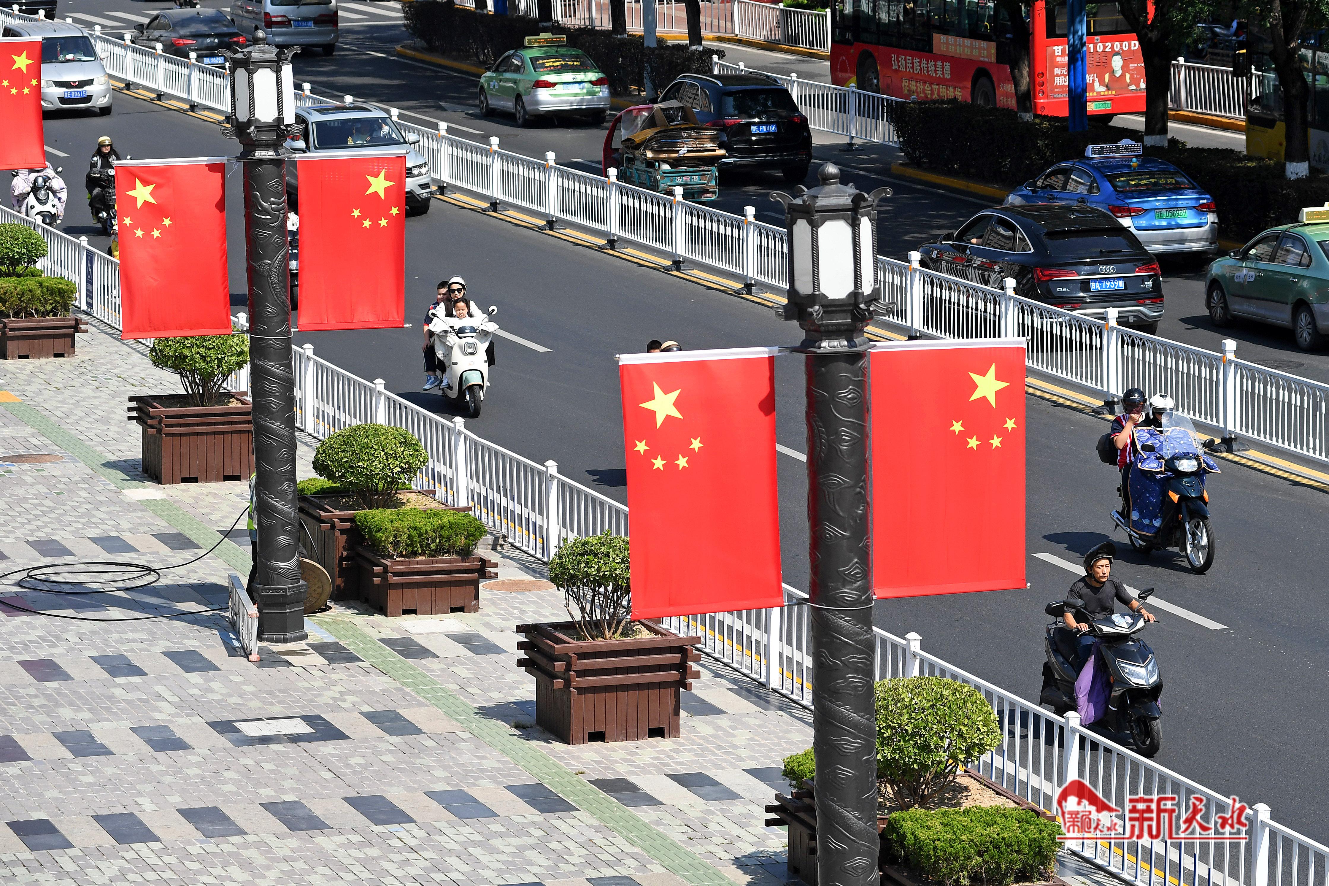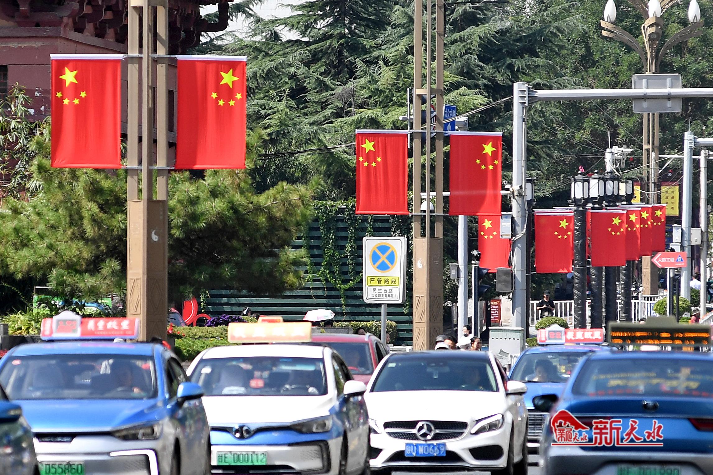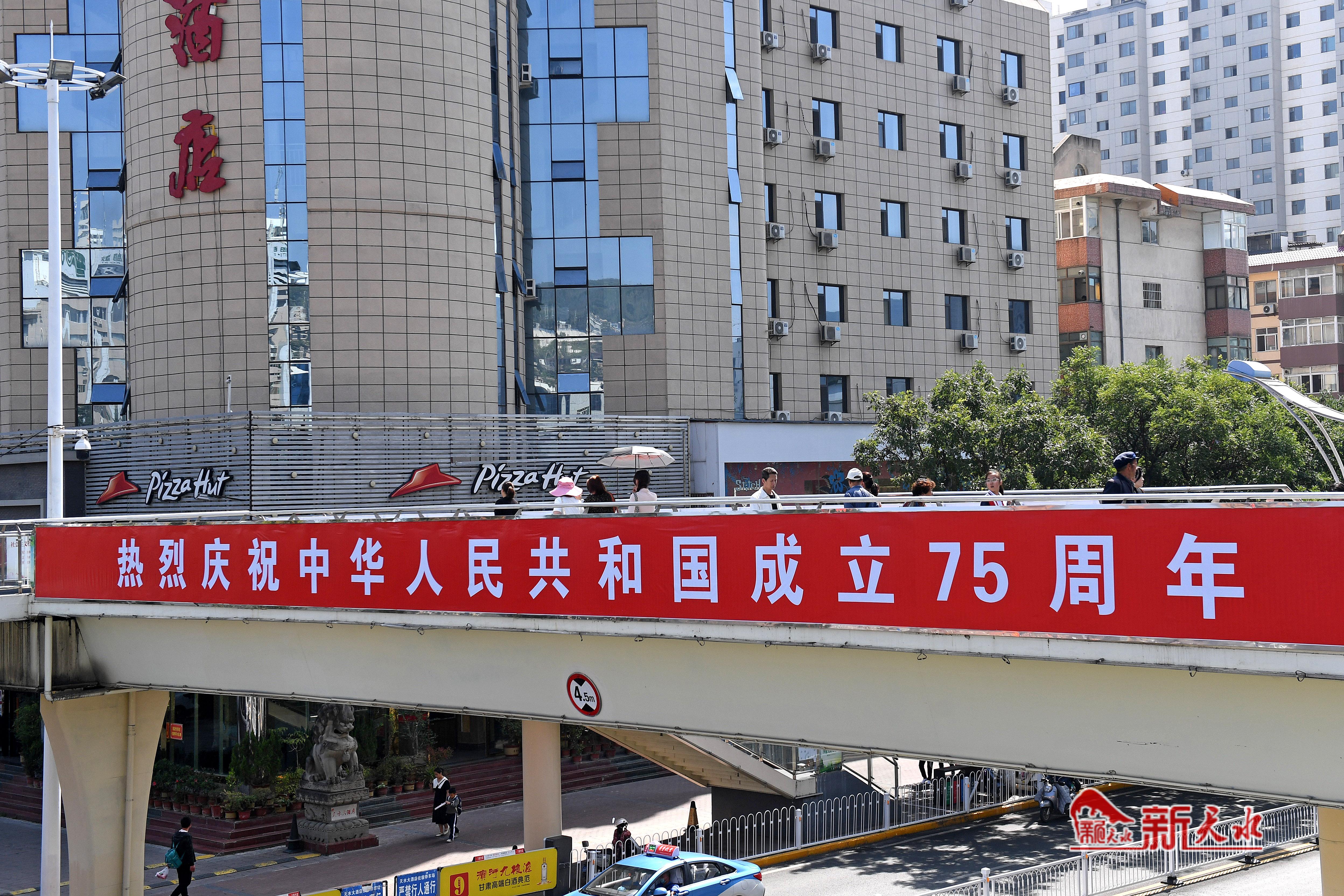 过街天桥上"热烈庆祝中华人民共和国成立75周年"的横幅引人注目