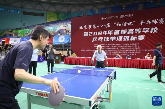 这是2024年6月1日,张燮林(后中)为北京市第十八届“和谐杯”乒乓球赛暨2024年首都高等学校乒乓球单项锦标赛开球。新华社发