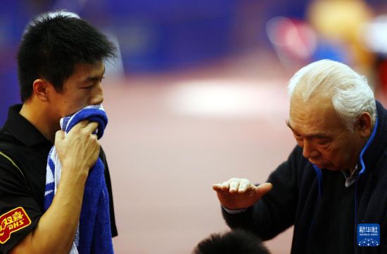这是2007年2月9日,张燮林(右)在北京举行的“直通萨格勒布”第49届世乒赛单项赛国乒男队选拔赛中为马龙讲解战术要领。新华社记者 毕明明 摄