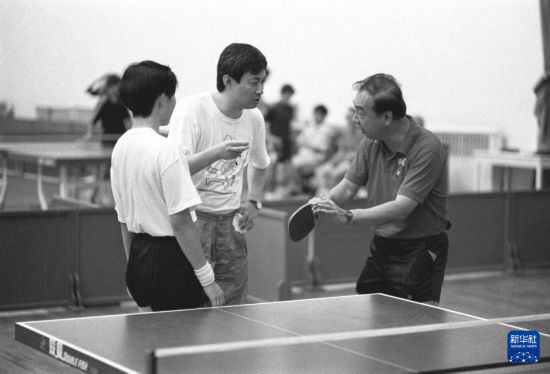 这是张燮林(右)在河北省正定乒乓球训练基地指导队员训练(资料照片)。新华社记者 张小军 摄