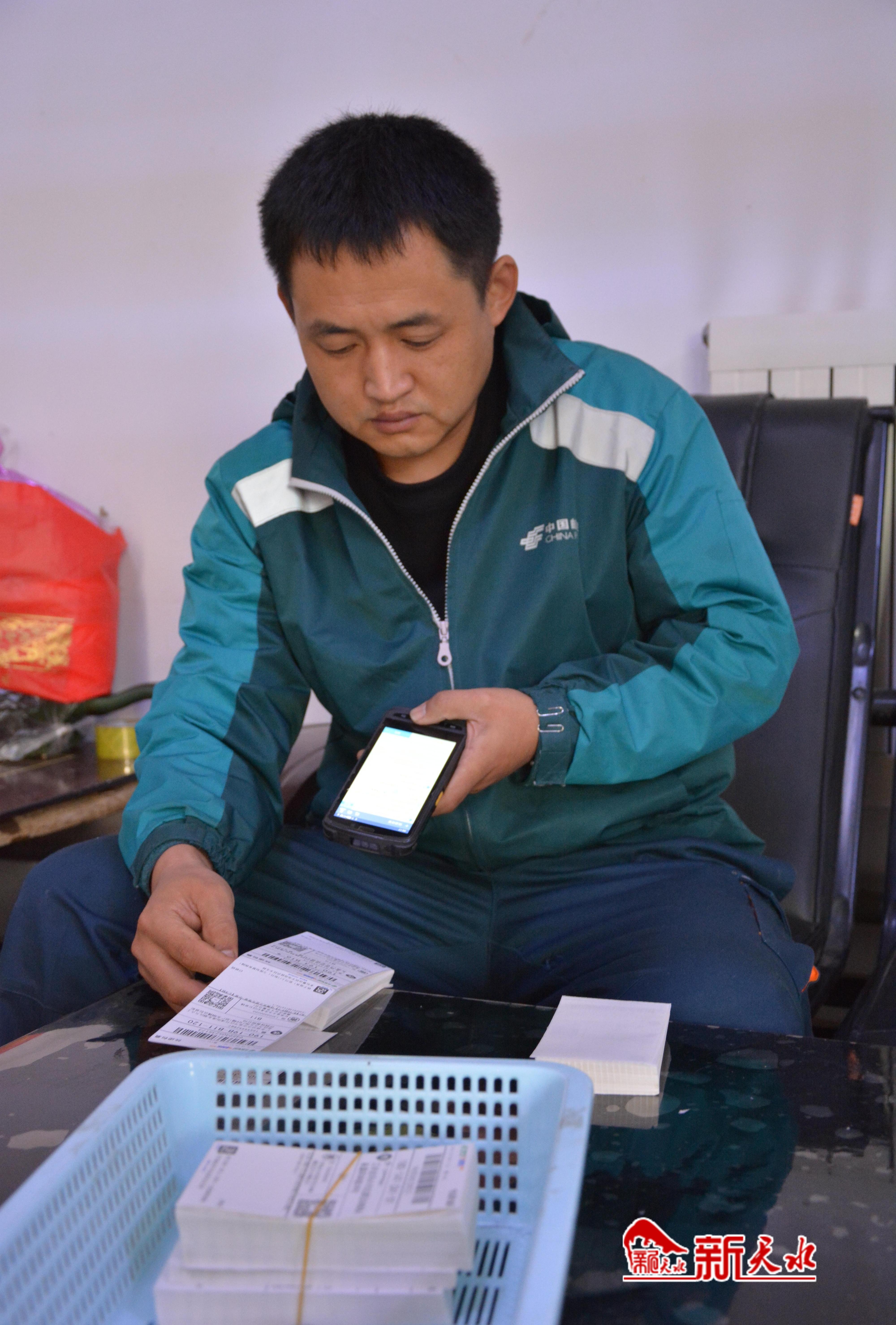 在公司办公室,中国邮政集团有限公司麦积区邮政分公司分路口揽投部揽投员杨文正拿着扫描仪扫描一摞摞面单。他告诉记者,以前是电商找快递,随着近几年网络物流的快速发展,现在是快递主动上门服务,全程为电商保驾护航。