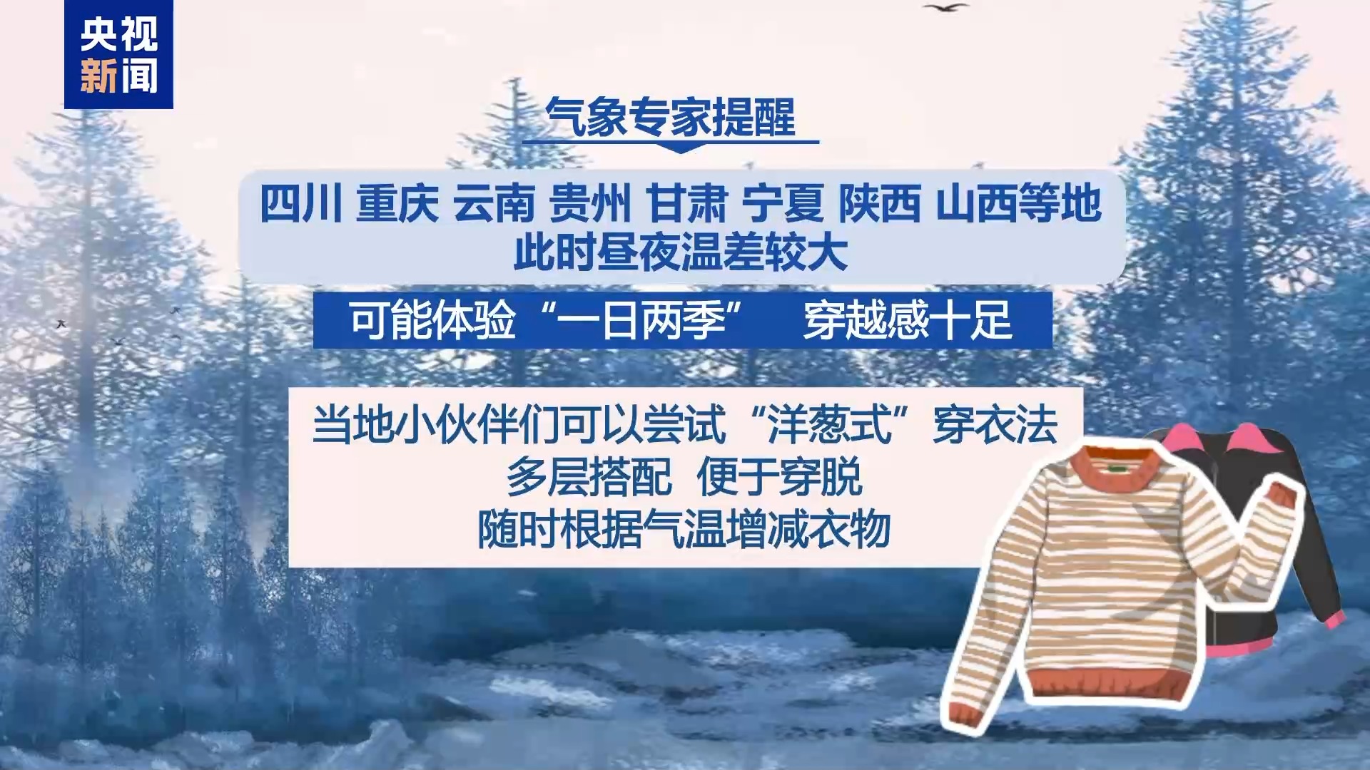 气象专家提醒,四川、重庆、云南、贵州、甘肃、宁夏、陕西、山西等地此时昼夜温差较大,可能体验“一日两季”,穿越感十足。当地小伙伴们可以尝试“洋葱式”穿衣法,多层搭配、便于穿脱,随时根据气温增减衣物。
