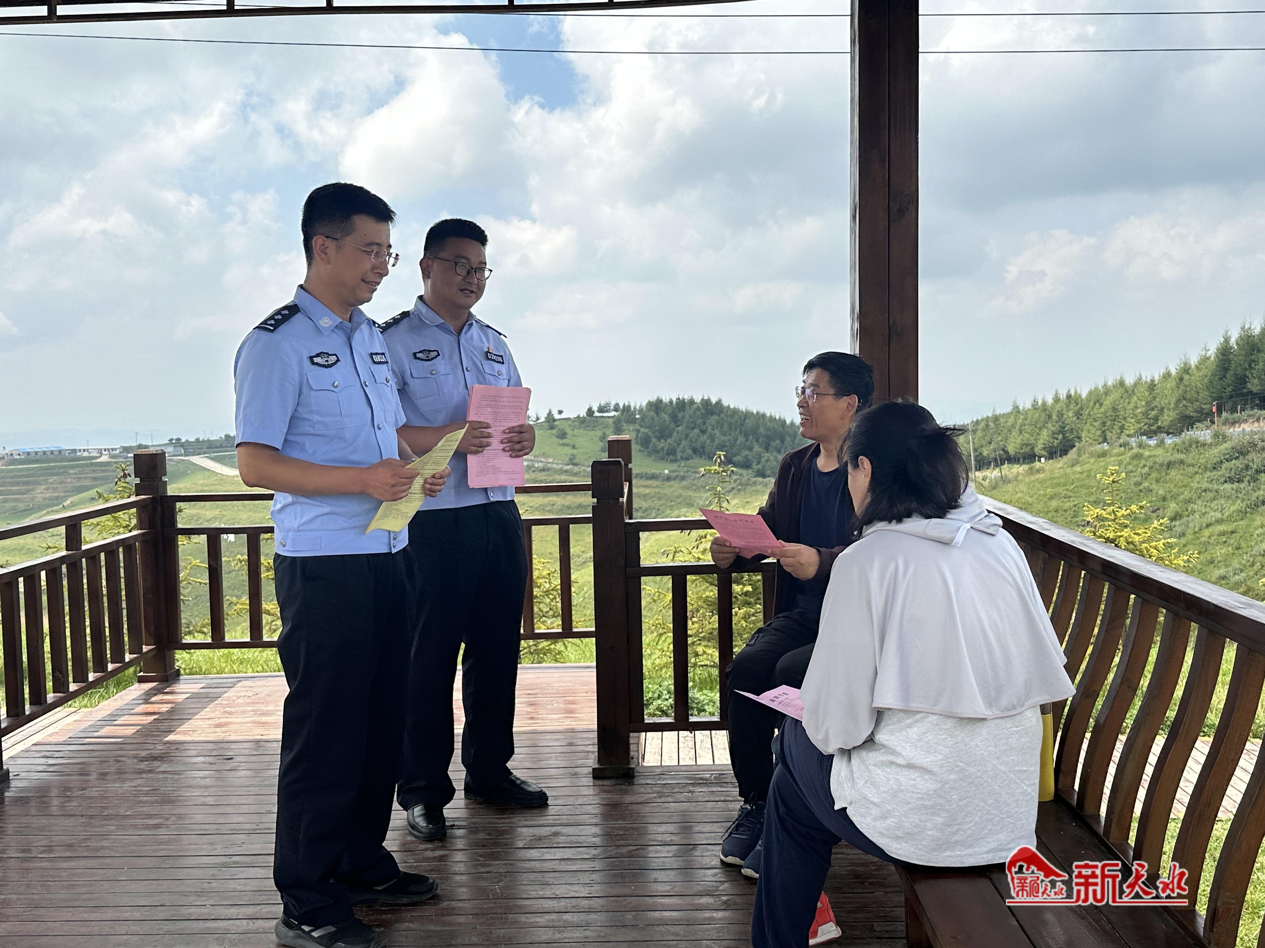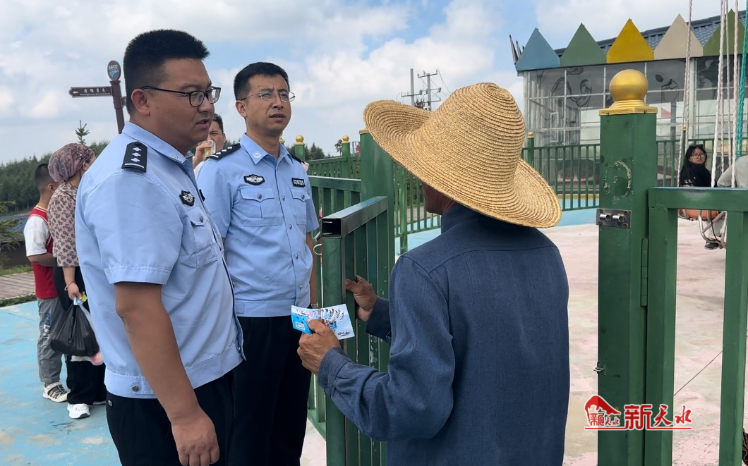 金秋时节,在张家川县平安牧场大草原景区,张家川县公安局平安派出所的民警正在给游客做安全提醒,并对景区内各处的游乐设施进行安全检查,随时对突发事件进行处置。