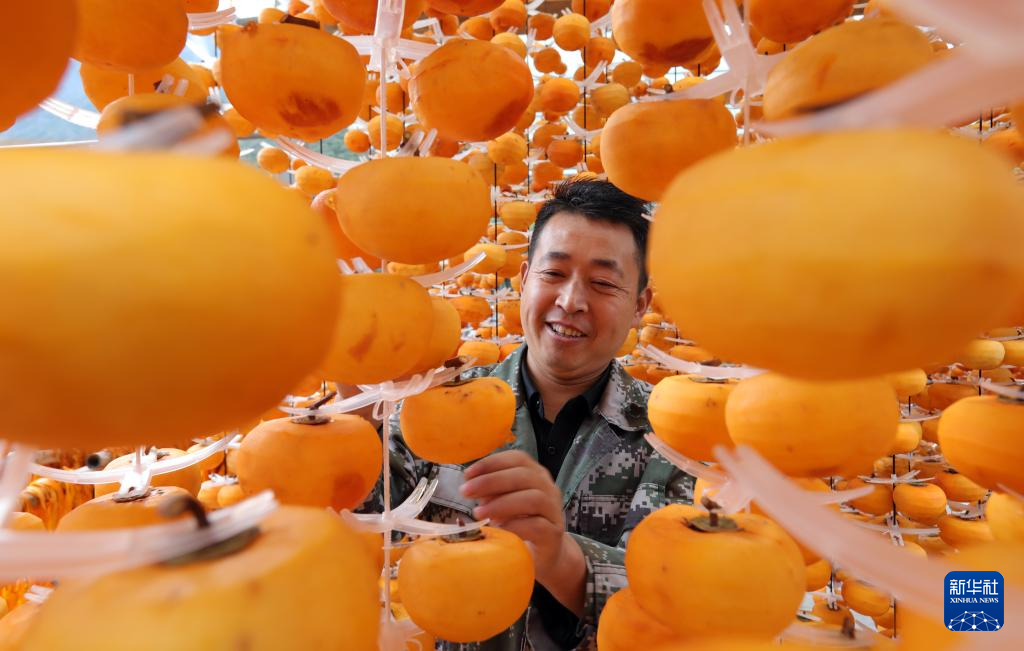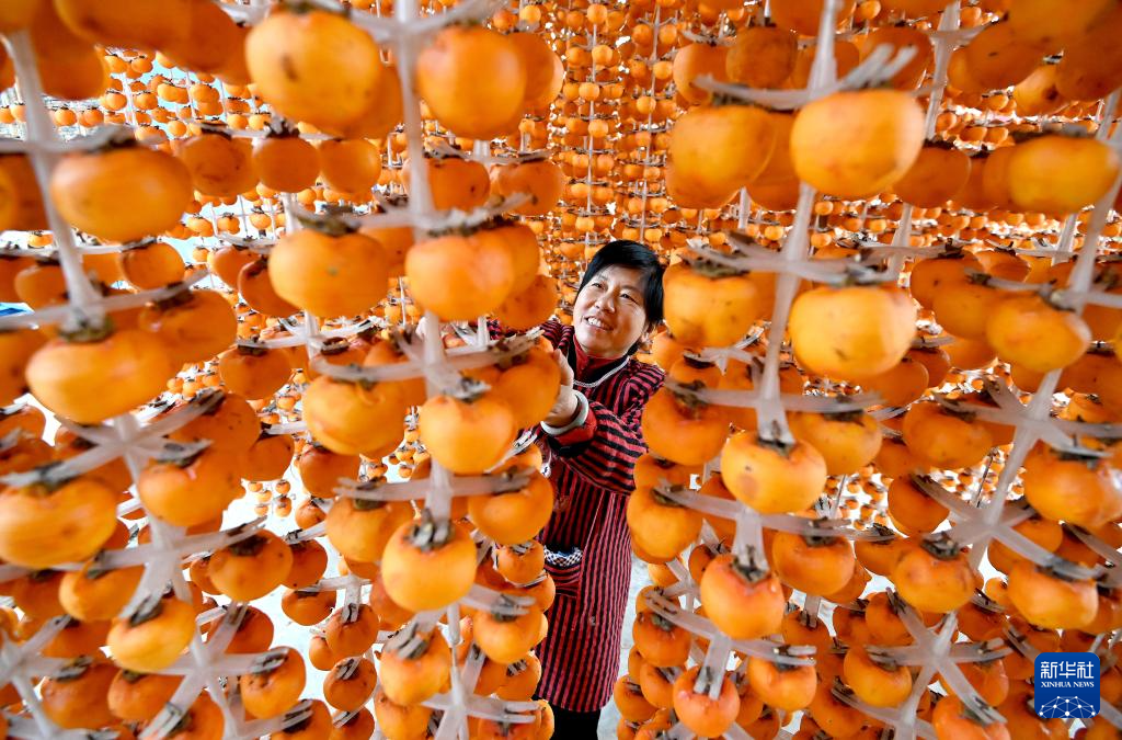 10月28日,河北省邯郸市磁县北贾璧乡北贾璧村的农民在吊晒柿子。新华社发(郝群英摄)