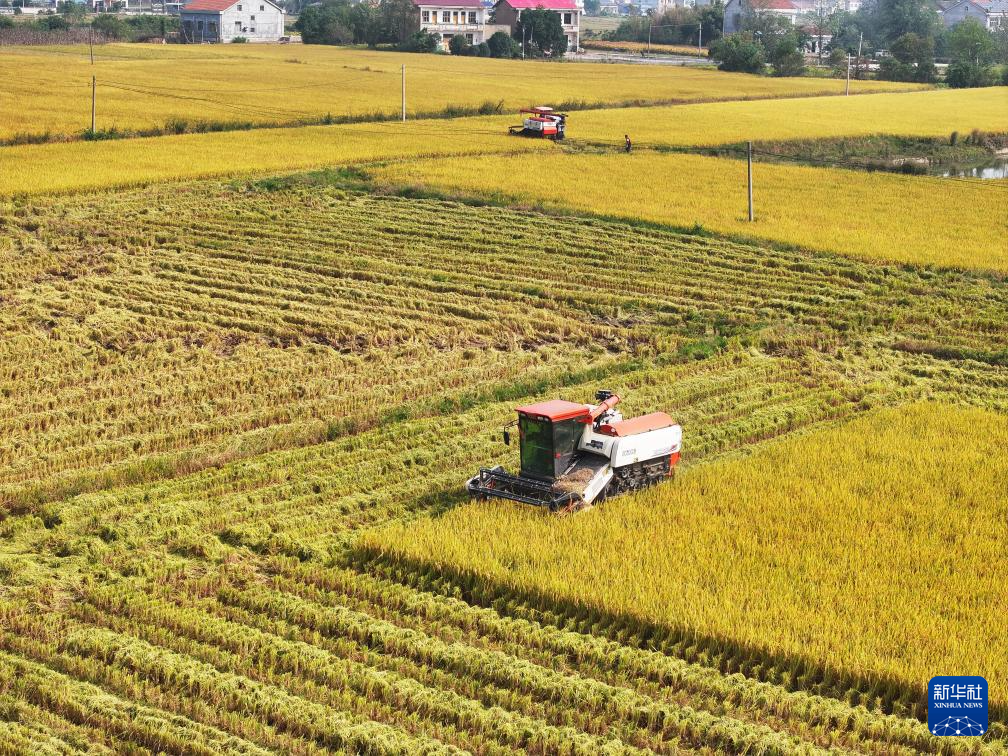 10月28日,在湖南省常德市澧县大堰垱镇戴家河村,农机手驾驶收割机收割晚稻(无人机照片)。新华社发(柏依朴摄)