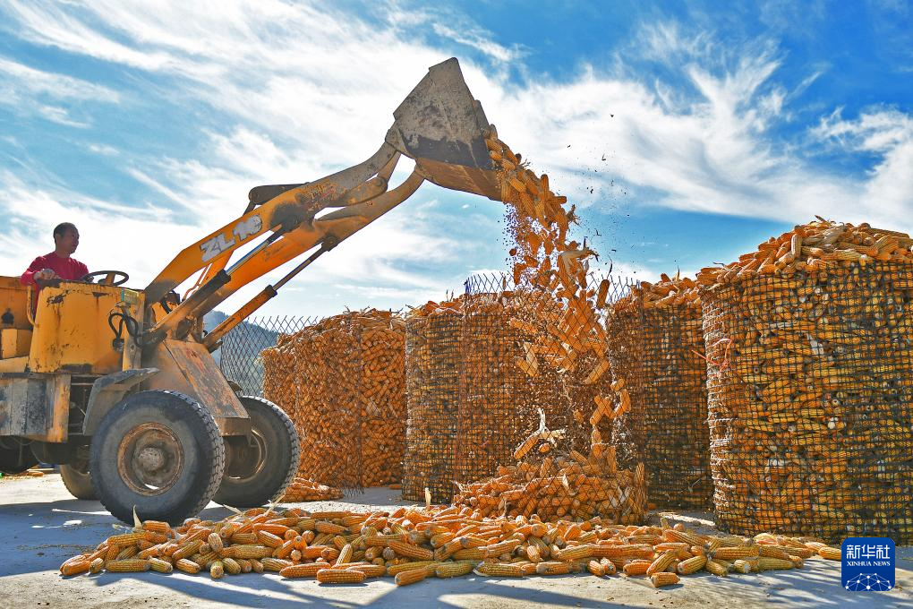 10月28日,山东省烟台市福山区高疃镇高疃村农民将晾晒好的玉米装入粮囤。新华社发(孙文潭摄)