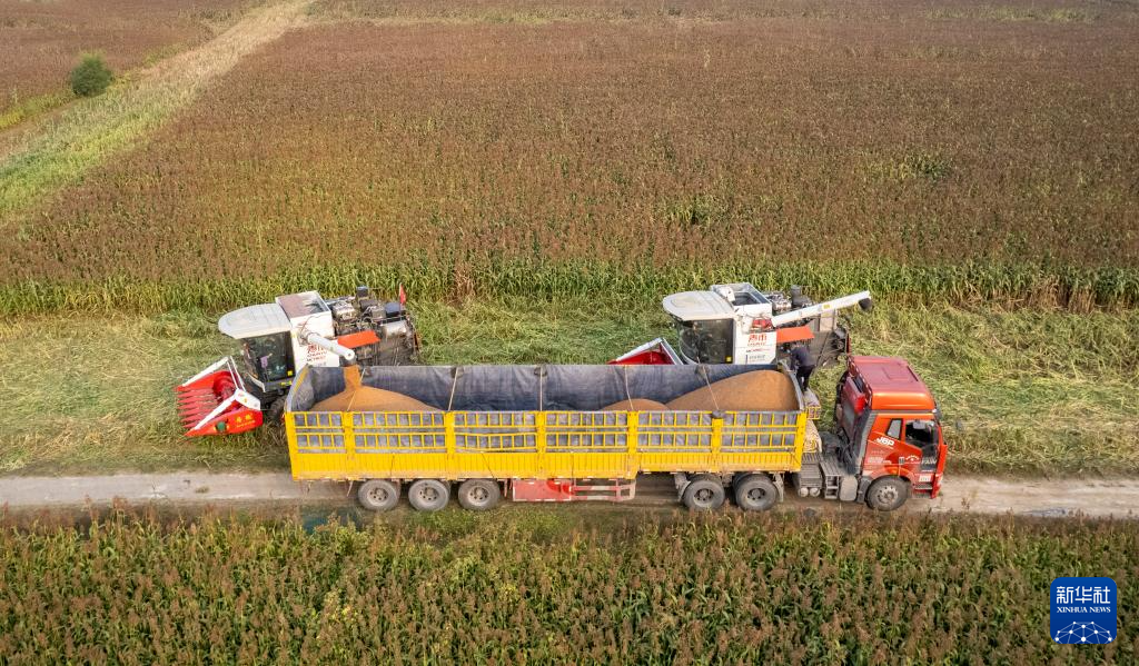 10月28日,在河南省商丘市夏邑县会亭镇花园村,收割机将收获的高粱装车外运(无人机照片)。新华社发(王高超摄)