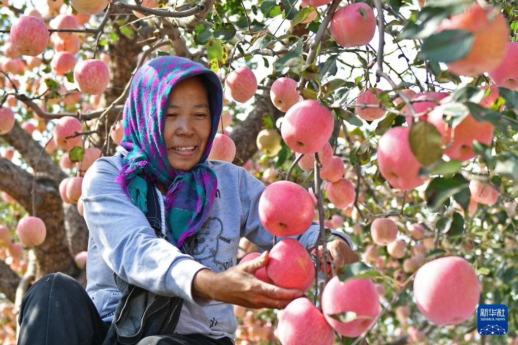 10月28日,山东省烟台市福山区高疃镇肖家夼村果农在果园里采摘苹果。新华社发(孙文潭摄)