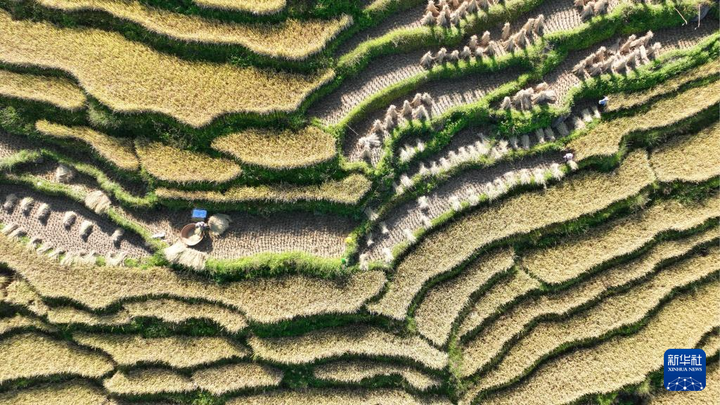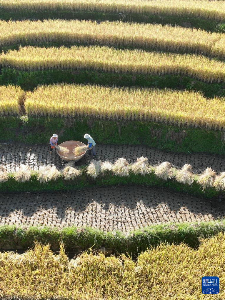 10月27日,在云南省腾冲市荷花镇汪李村,农民在收获晚稻(无人机照片)。新华社发(龚祖金摄)